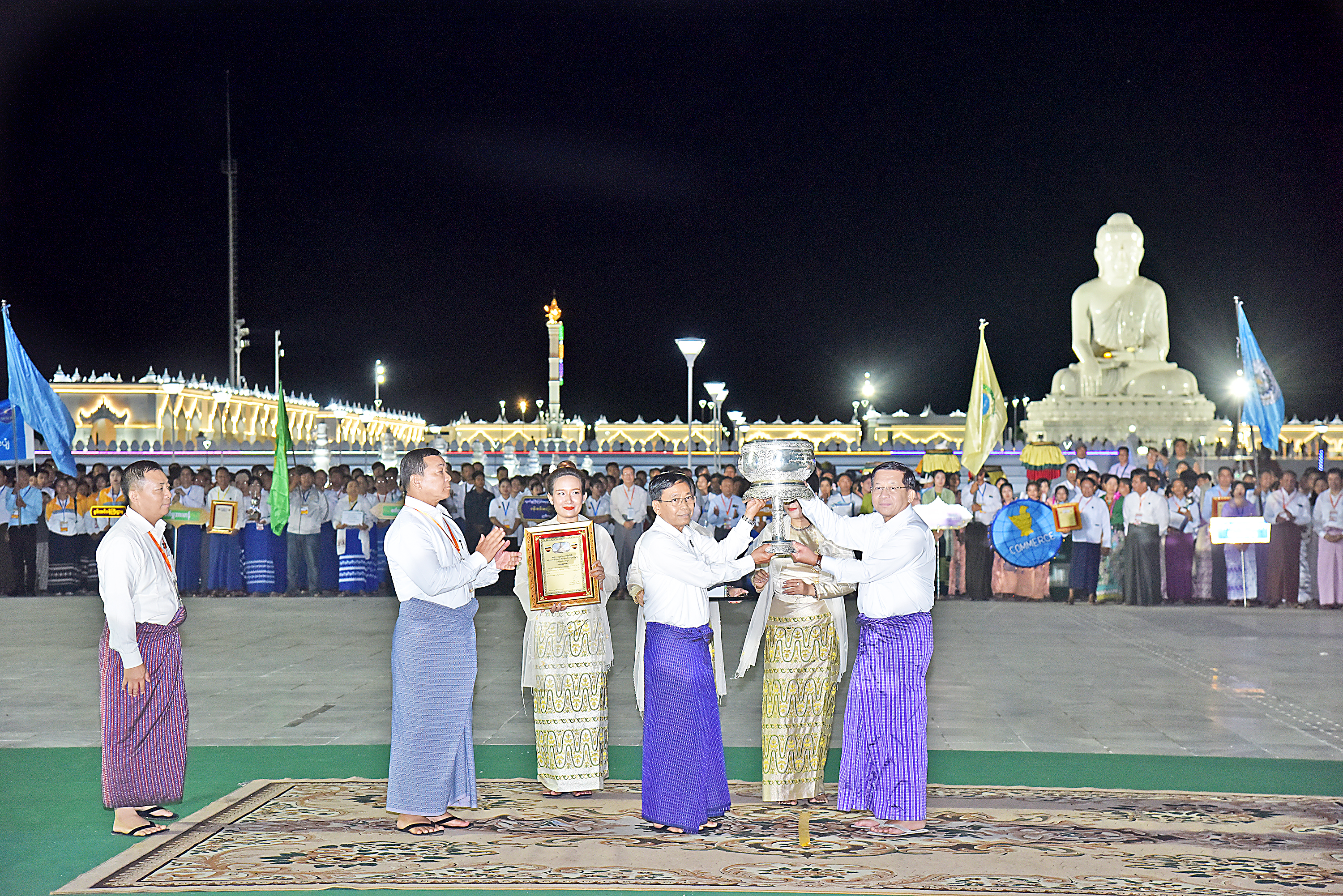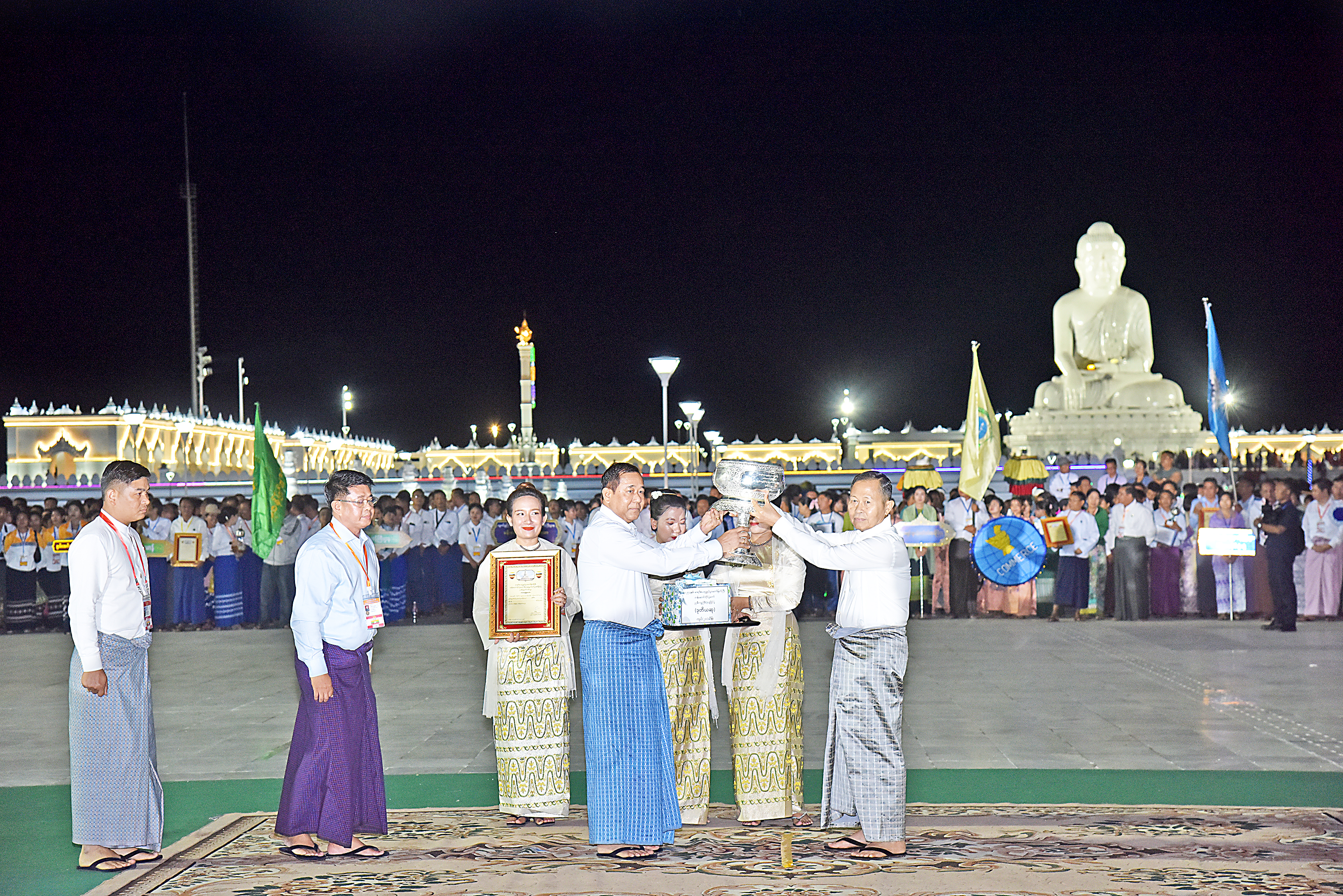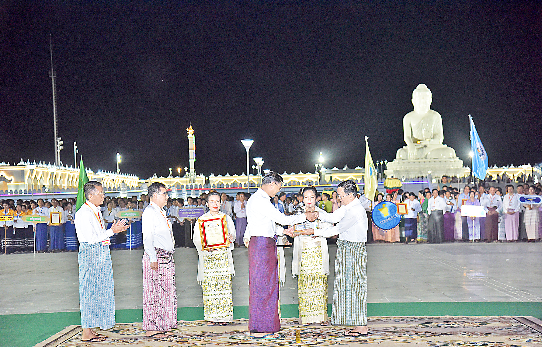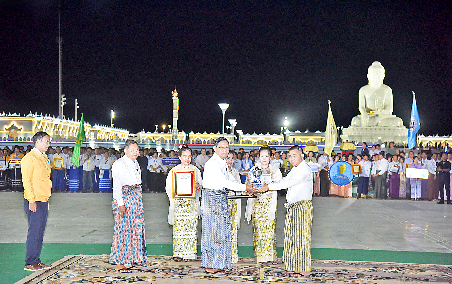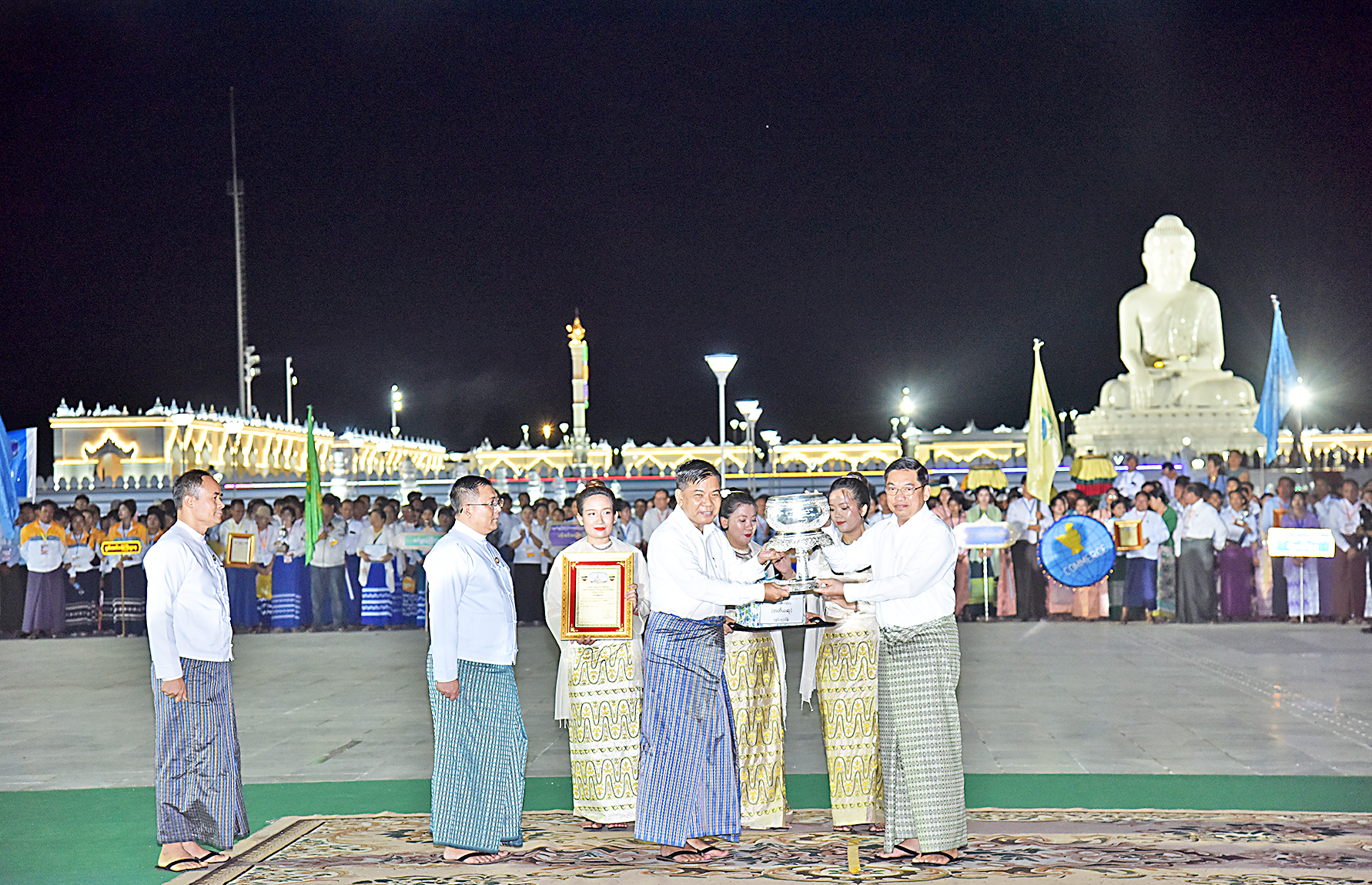 ယင်းနောက် နိုင်ငံတော်ယာယီသမ္မတ နိုင်ငံတော်လုံခြုံရေးနှင့် အေးချမ်းသာယာ ရေးကော်မရှင်ဥက္ကဋ္ဌက ညမီးကြီး(ညမီးကျည်)မီးပုံးပျံလွှတ်တင် ပူဇော်ပြိုင်ပွဲတွင် ပထမဆုရရှိသည့် နေပြည်တော်စည်ပင်သာယာရေးကော်မတီကိုယ်စားပြုအသင်း၊ စိန်နားပန်မီးပုံးပျံလွှတ်တင်ပူဇော်ပြိုင်ပွဲတွင် ပထမဆုရရှိသည့် လူမှုဝန်ထမ်း၊ကယ်ဆယ်ရေးနှင့် ပြန်လည်နေရာချထားရေးဝန်ကြီးဌာန ကိုယ်စားပြုအသင်းနှင့် မသိုးရွှေကြာ သင်္ကန်းရက်လုပ် ပူဇော်ပြိုင်ပွဲတွင် ပထမဆုရရှိသည့် မန္တလေးတိုင်းဒေသကြီးကိုယ်စားပြု အမရရွှေပြည်ရက္ကန်းစင် အသင်းတို့အား ဆုဖလား၊ ဂုဏ်ပြုချီးမြှင့်ငွေနှင့် ဂုဏ်ပြု မှတ်တမ်းလွှာများပေးအပ်ချီးမြှင့်သည်။