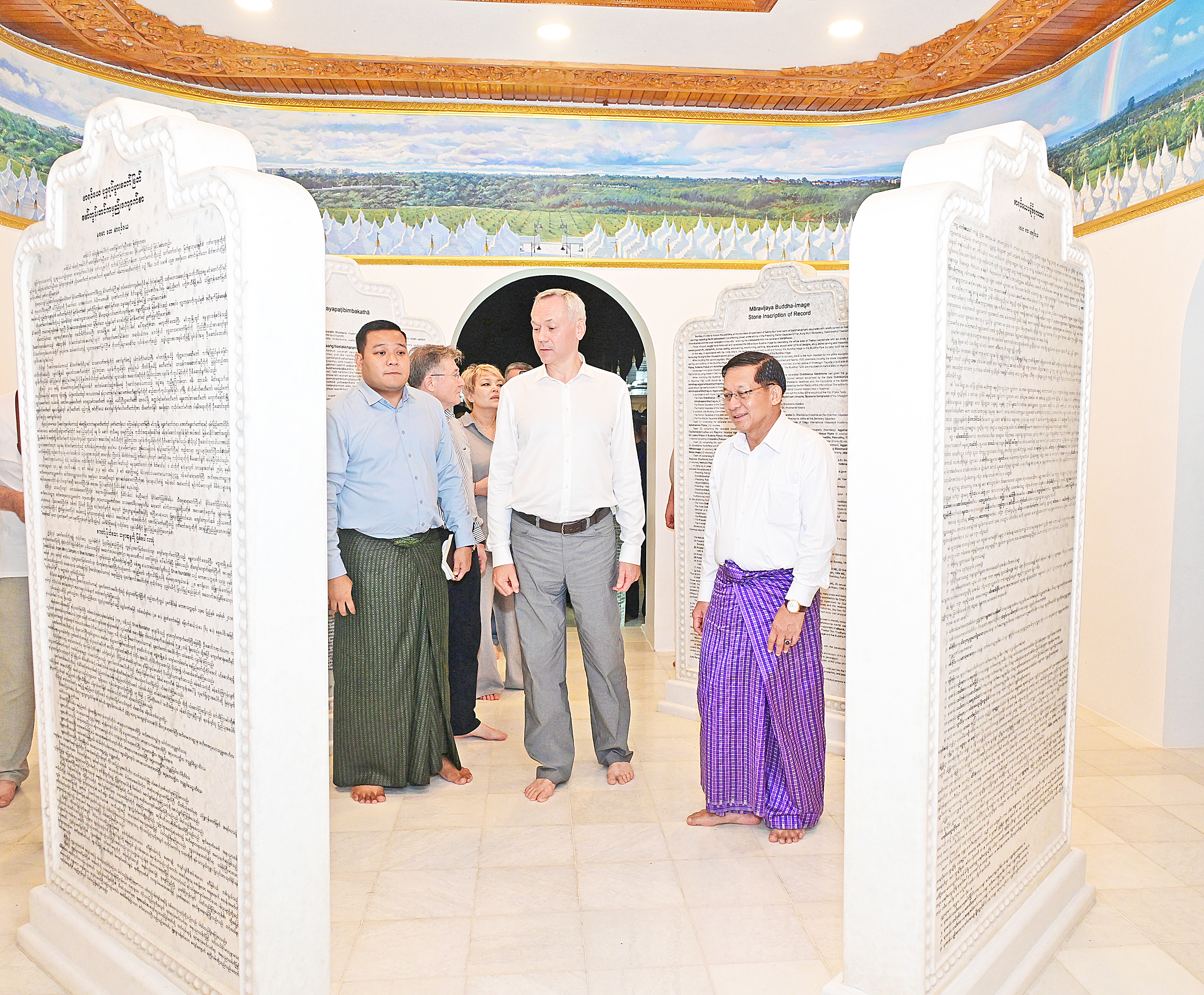 ထို့နောက် နိုင်ငံတော်ယာယီသမ္မတ နိုင်ငံတော်လုံခြုံရေးနှင့် အေးချမ်းသာယာ ရေးကော်မရှင်ဥက္ကဋ္ဌနှင့်ဇနီး၊ ရုရှားဖက်ဒရေးရှင်းနိုင်ငံ၊ နိုဗိုစီဗစ်ဒေသအုပ်ချုပ်ရေးမှူး နှင့် ကိုယ်စားလှယ်အဖွဲ့တို့သည် ကျောက်စာရုံစေတီတော်များအတွင်း လှည့်လည် ကြည့်ရှုလေ့လာကြပြီး နိုင်ငံတော်ယာယီသမ္မတ နိုင်ငံတော်လုံခြုံရေးနှင့် အေးချမ်းသာယာရေးကော်မရှင်ဥက္ကဋ္ဌက မာရဝိဇယရုပ်ပွားတော်မြတ်ကြီးအား မြန်မာ့ရိုးရာဓလေ့ ထုံးတမ်းစဉ်လာများ၊ ခေတ်မီနည်းပညာများပေါင်းစပ်၍ ဗိသုကာလက်ရာမြောက်စွာ တည်ထားကိုးကွယ်ထားရှိမှု များကို ရှင်းလင်းပြောကြားသည်။