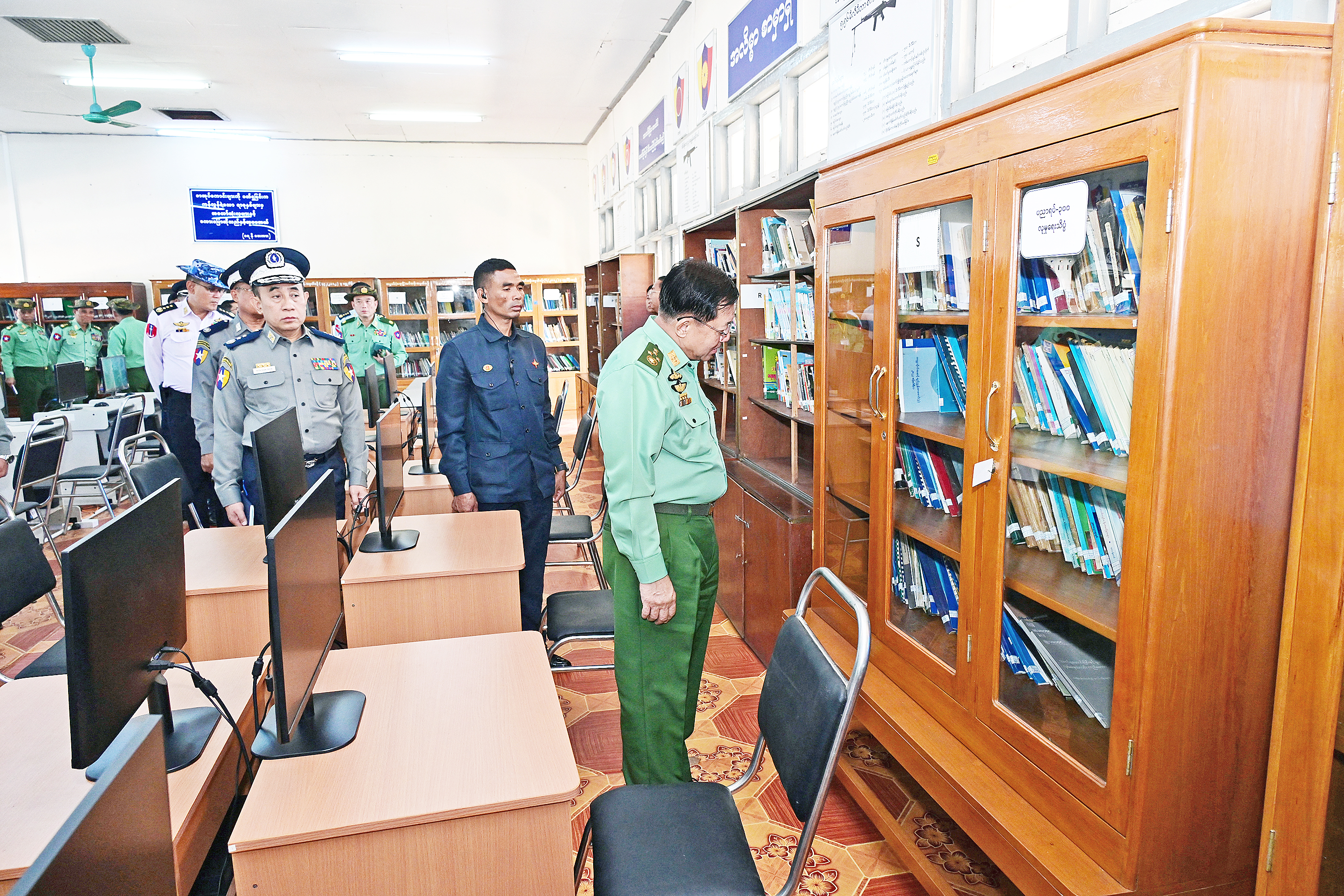 ၎င်းနောက် နိုင်ငံတော်ယာယီသမ္မတ နိုင်ငံတော်လုံခြုံရေးနှင့်အေးချမ်းသာယာ ရေးကော်မရှင်ဥက္ကဋ္ဌနှင့်အဖွဲ့ဝင်များသည် သင်တန်းကျောင်း စာကြည့်တိုက်အတွင်း လှည့်လည်ကြည့်ရှုစစ်ဆေးပြီး တာဝန်ရှိသူများ၏ တင်ပြချက်များအပေါ် သင်တန်းသားများ ဗဟုသုတတိုးပွားစေရေးအတွက် စာအုပ်စာစောင်များဖတ်ရှုစေရေး ဆောင်ရွက် ပေးရန်လိုကြောင်း၊ စာကြည့်တိုက်အတွင်း စာအုပ်များစနစ်တကျထားရှိရန်နှင့် သုတ၊ ရသ စာအုပ်စာစောင်များကိုလည်း ထပ်မံဖြည့်ဆည်းဆောင်ရွက်သွားရန်လိုကြောင်းနှင့် အခြားလိုအပ်သည်များကို လမ်းညွှန်မှာကြားသည်။