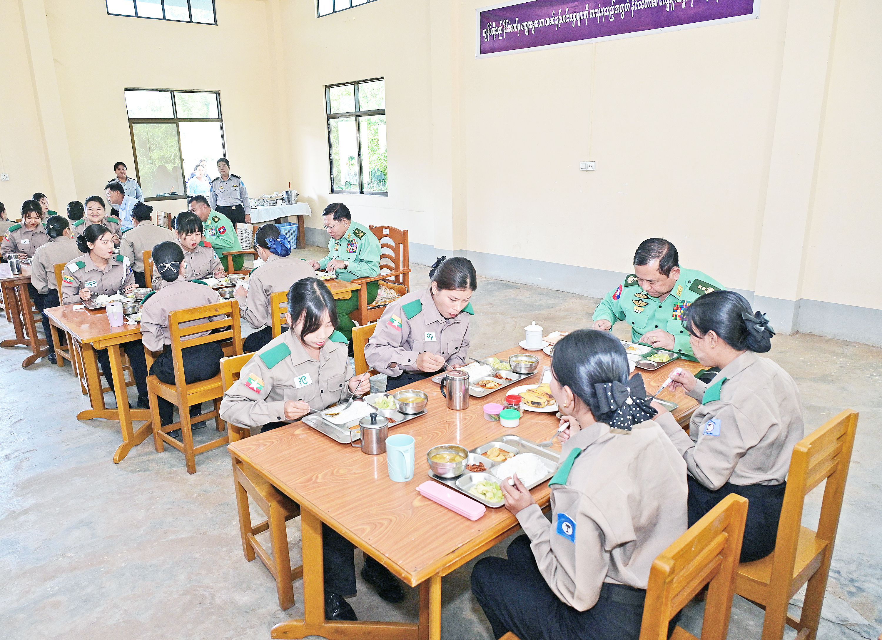 ထို့နောက် နိုင်ငံတော်ယာယီသမ္မတ နိုင်ငံတော်လုံခြုံရေးနှင့် အေးချမ်းသာယာ ရေးကော်မရှင်ဥက္ကဋ္ဌနှင့် အဖွဲ့ဝင်များသည် ခတ္တာဆောင်ရှိ သင်တန်းသူအိပ်ဆောင် များအား လိုက်လံကြည့်ရှုစစ်ဆေးပြီး စားရိပ်သာ၌ အခြေခံဆရာ၊ ဆရာမ အထူးမွမ်းမံ သင်တန်းအမှတ်စဉ်(၈၂) သင်တန်းသူ ဆရာမများနှင့်အတူ နေ့လယ်စာကို အတူတကွသုံးဆောင်ကြပြီးနေ့လယ်စာသုံးဆောင်အပြီးတွင်သင်တန်းသူ ဆရာမများအား ရင်းရင်းနှီးနှီးနှုတ်ဆက်သည်။