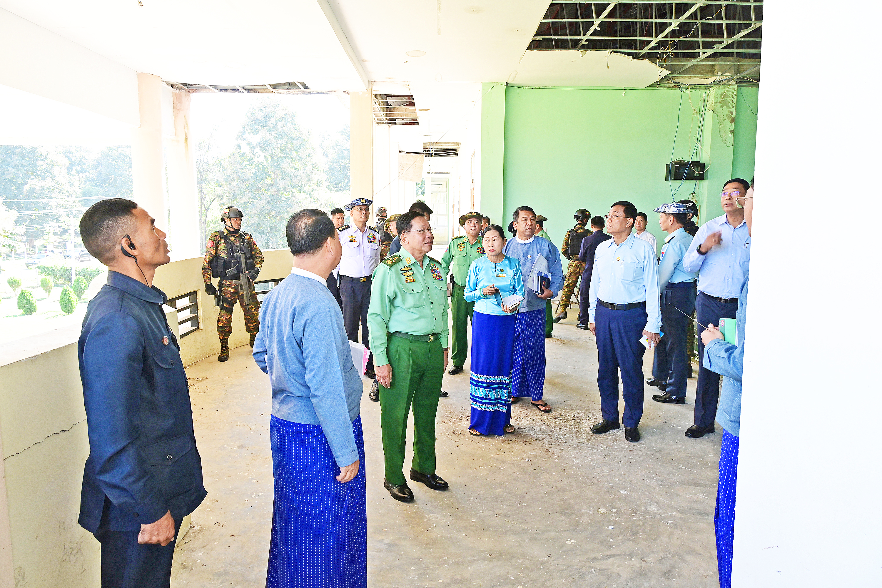 ယင်းနောက် နိုင်ငံတော်ယာယီသမ္မတ နိုင်ငံတော်လုံခြုံရေးနှင့် အေးချမ်းသာယာ ရေးကော်မရှင်ဥက္ကဋ္ဌနှင့် အဖွဲ့ဝင်များသည် နိုင်ငံ့ဝန်ထမ်းတက္ကသိုလ်အတွင်း မော်တော် ယာဉ်များဖြင့် လှည့်လည်ကြည့်ရှုစစ်ဆေးပြီး ငလျင်ဒဏ်ကြောင့် ထိခိုက်ပျက်စီးမှုဖြစ်ပေါ်ခဲ့သည့် နီလာခန်းမနှင့် မဟော်သဓခန်းမတို့အား လိုက်လံကြည့်ရှုစစ်ဆေးကာ တာဝန်ရှိသူများ၏ တင်ပြချက်များအပေါ် လိုအပ်သည်များ လမ်းညွှန်မှာကြားသည်။