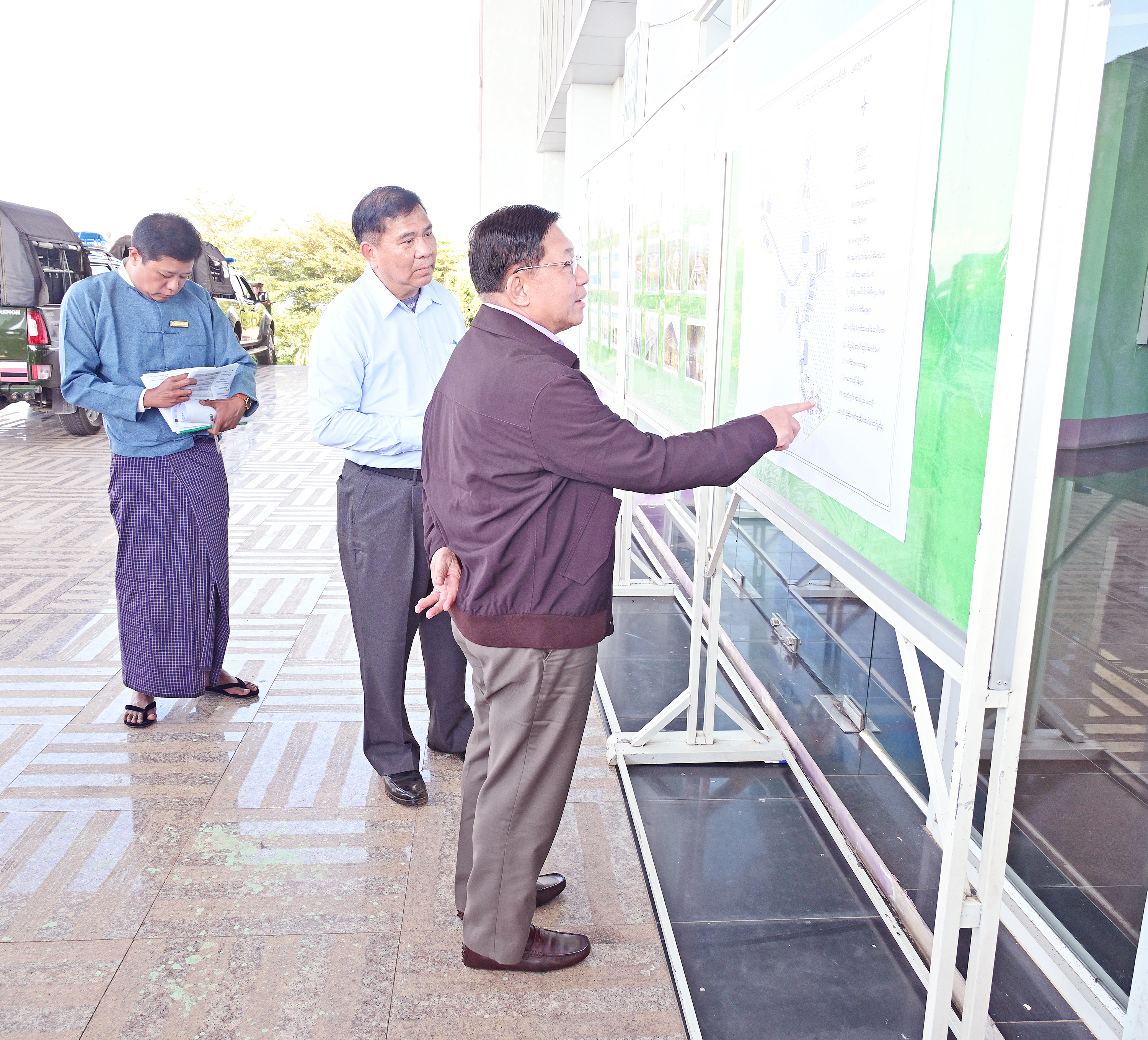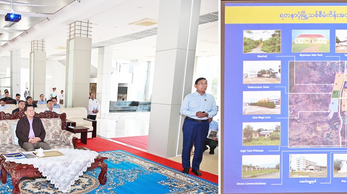 ဦးစွာ နိုင်ငံတော်ယာယီသမ္မတ နိုင်ငံတော်လုံခြုံရေးနှင့် အေးချမ်းသာယာရေးကော် မရှင်ဥက္ကဋ္ဌနှင့် အဖွဲ့ဝင်များသည် ရတနာပုံမြို့သစ်စီမံကိန်းရှိ ရတနာပုံတယ်လီပို့ အဆောက် အဦသို့ ရောက်ရှိရာ ဆောက်လုပ်ရေးဝန်ကြီးဌာန ပြည်ထောင်စုဝန်ကြီး ဦးမျိုးသန့်က ရတနာပုံမြို့သစ်စီမံကိန်းဆိုင်ရာအချက်အလက်များ၊ စီမံကိန်းအတွင်း ဆောင်ရွက်ထားရှိမှု၊ လူနေအိမ်ရာများ အကောင်အထည်ဖော်ဆောင်ရွက်ထားရှိမှု၊ ရတနာပုံတယ်လီပို့ဆိုင်ရာ အဆောက်အဦများ အကောင်အထည်ဖော်ဆောင်ရွက် ထားရှိမှု၊ စီမံကိန်းနယ်မြေအတွင်း လမ်းဖောက်လုပ်ခြင်း၊ ရေရရှိရေး၊ လျှပ်စစ်မီးရရှိ ရေးနှင့် အခြေခံအဆောက်အဦများ ဆောင်ရွက်ထားရှိမှု၊ စီမံကိန်းဆောင်ရွက်ရန် Expression Of Interest – EOI ဖိတ်ခေါ်ဆောင်ရွက်ထားရှိမှု၊နည်းပညာစက်မှုဇုန်အကောင် အထည်ဖော်ဆောင်ရွက်ထားရှိမှုအခြေအနေများ၊ လုပ်ငန်းများလည်ပတ်လျက်ရှိမှုနှင့် စီမံကိန်း ဆက်လက်ဆောင်ရွက်နိုင်မည့်အခြေအနေများကိုလည်းကောင်း၊ ပို့ဆောင်ရေး နှင့် ဆက်သွယ်ရေးဝန်ကြီးဌာန ပြည်ထောင်စုဝန်ကြီး ဦးမြထွန်းဦးက ရတနာပုံမြို့သစ် စီမံကိန်းဆိုင်ရာအချက်အလက်များ၊ စီမံကိန်းအဆင့်အလိုက် အကောင်အထည်ဖော် ဆောင်ရွက်လျက်ရှိမှု၊ မြန်မာ့ဆက်သွယ်ရေးလုပ်ငန်းပိုင် အုပ်ချုပ်မှုဆိုင်ရာအဆောက်အဦများ၊ ဝန်ထမ်းအိမ်ရာများဆိုင်ရာ အချက်အလက်များ၊ ရတနာပုံတယ်လီပို့ ကုမ္ပဏီလီမိတက်ပိုင် အဆောက်အဦများဆိုင်ရာ အချက်အလက်များ၊ Soft Base Factories Area ရှိစက်ရုံများဆိုင်ရာအချက်အလက်များနှင့်ပတ်သက်၍လည်းကောင်း ရှင်းလင်းတင်ပြကြသည်။