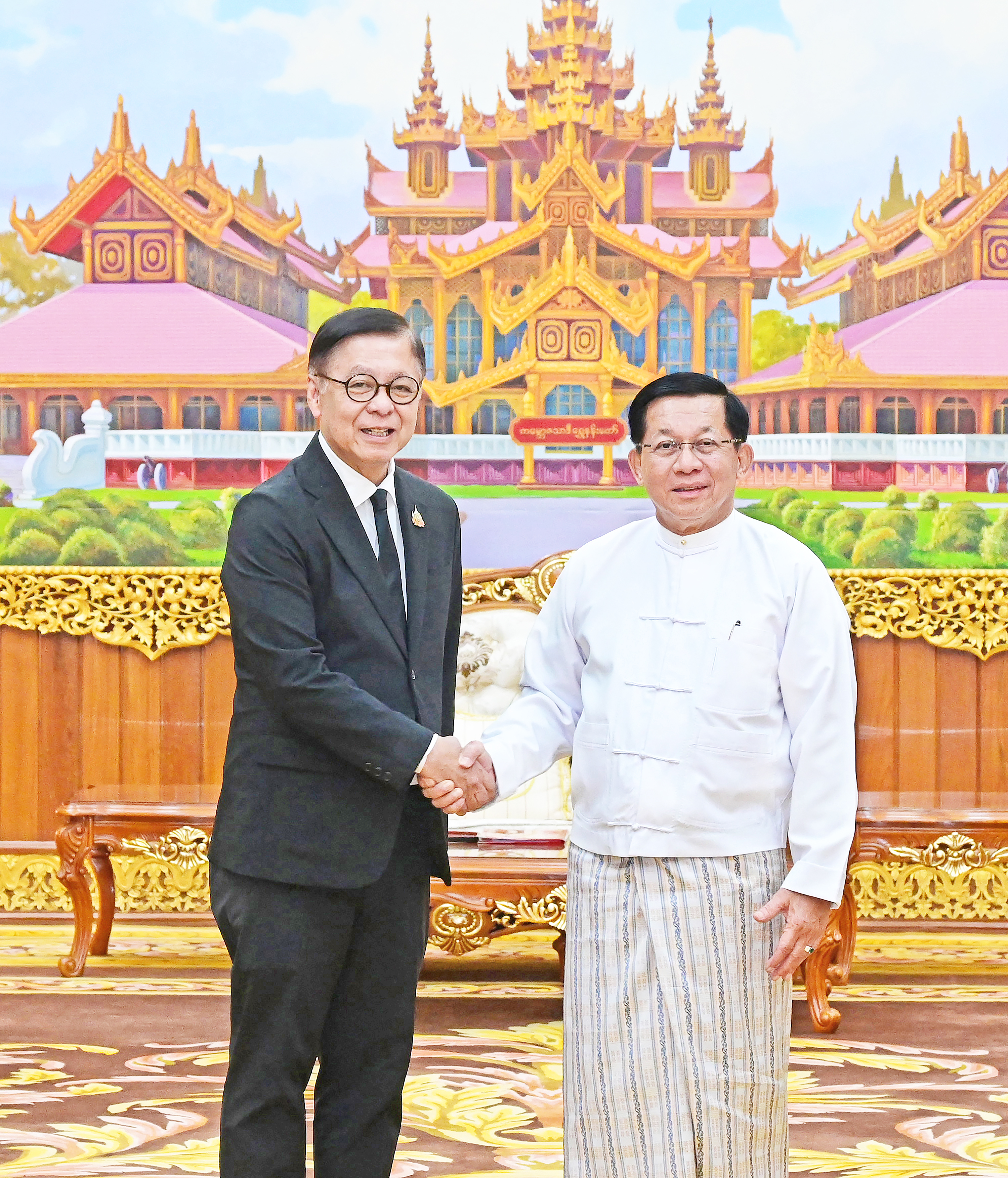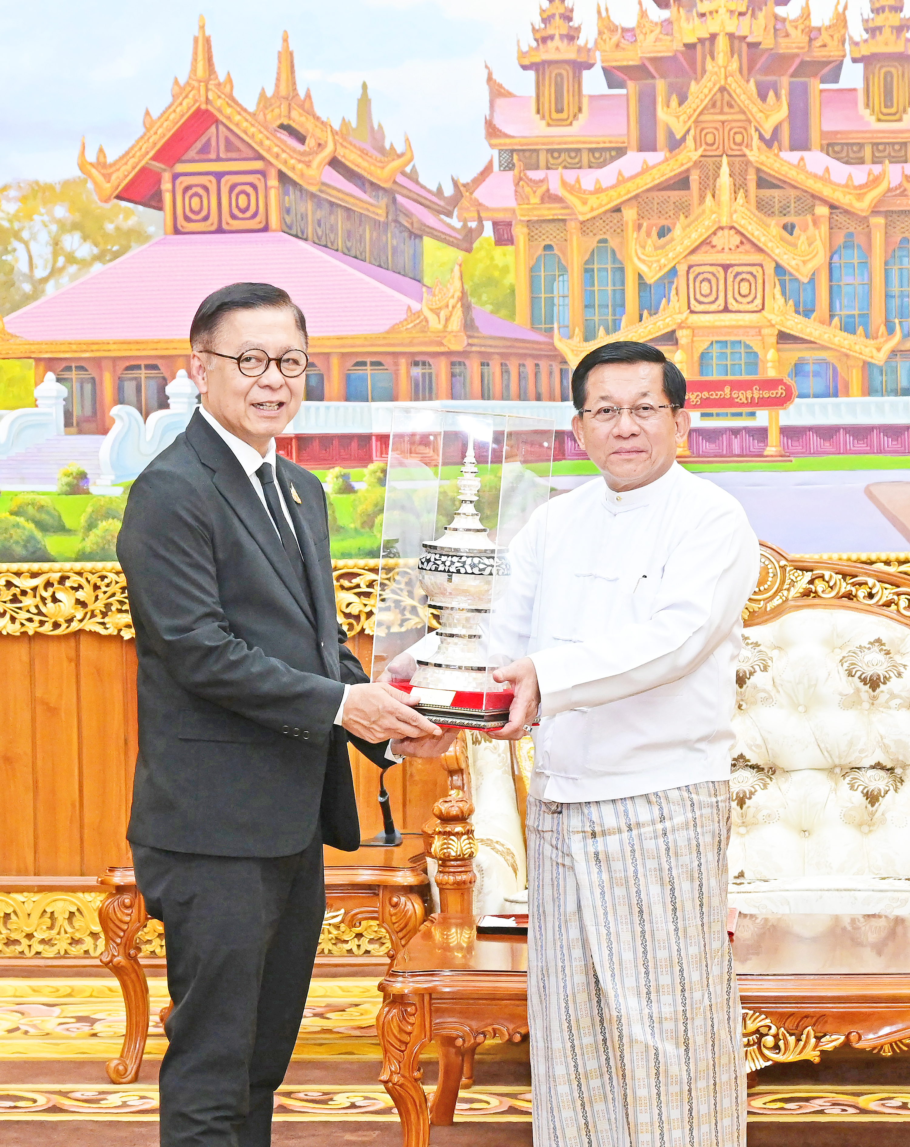ပြည်ထောင်စုသမ္မတမြန်မာနိုင်ငံတော် ယာယီသမ္မတ နိုင်ငံတော်လုံခြုံရေးနှင့် အေးချမ်း သာယာရေးကော်မရှင်ဥက္ကဋ္ဌ ဗိုလ်ချုပ်မှူးကြီးမင်းအောင်လှိုင်ထံ ထိုင်းနိုင်ငံ၊ နိုင်ငံခြားရေးဝန်ကြီး H.E.Mr.Sihasak Phuangketkeowဦးဆောင်သည့် ကိုယ်စားလှယ် အဖွဲ့က ယနေ့မွန်းလွဲပိုင်းတွင်နေပြည်တော်ရှိ ဘုရင့်နောင်ရိပ်သာဧည့် ခန်းမ၌ လာရောက် ဂါရဝပြုတွေ့ဆုံသည်။