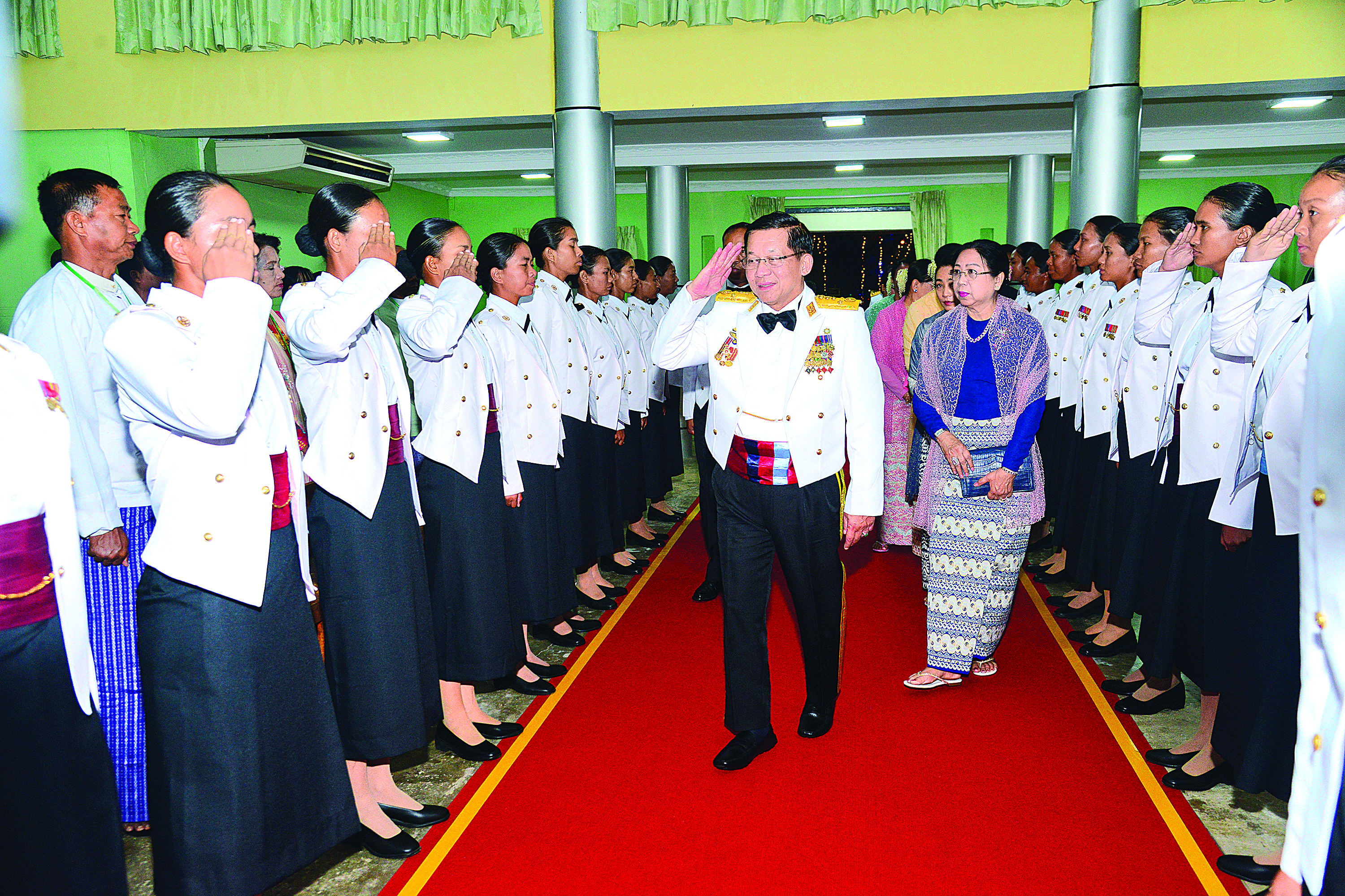 ယင်းနောက် နိုင်ငံတော်လုံခြုံရေးနှင့် အေးချမ်းသာယာရေးကော်မရှင်ဥက္ကဋ္ဌ တပ်မတော် ကာကွယ်ရေးဦးစီးချုပ်နှင့် အဖွဲ့ဝင်များသည် သင်တန်းဆင်း အမျိုးသမီးအရာရှိများနှင့် အတူ မြဝတီသဘင်ဆောင်၌ ပြည်သူ့ဆက်ဆံရေးနှင့် စိတ်ဓာတ်စစ်ဆင်ရေး ညွှန်ကြား ရေးမှူးရုံး ကွပ်ကဲမှုအောက် မြဝတီတေးဂီတအဖွဲ့၏တေးသီချင်းများ၊ တစ်ခန်း ရပ်ပြ ဇာတ်ဖြင့် ဂုဏ်ပြုဖျော်ဖြေတင်ဆက်မှုများအား ကြည့်ရှုအားပေးခဲ့ကြသည်။