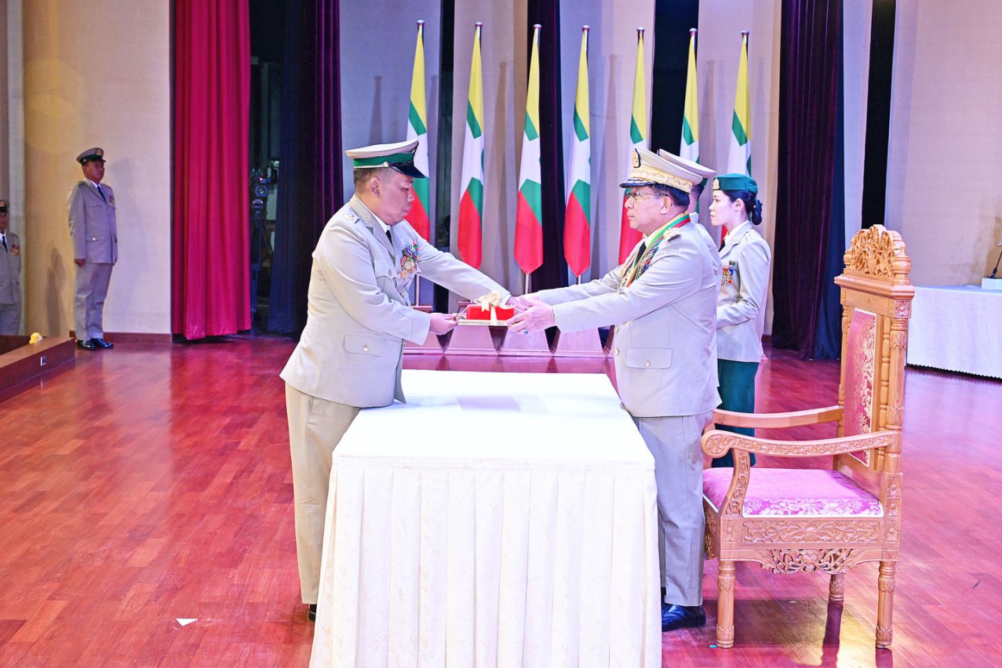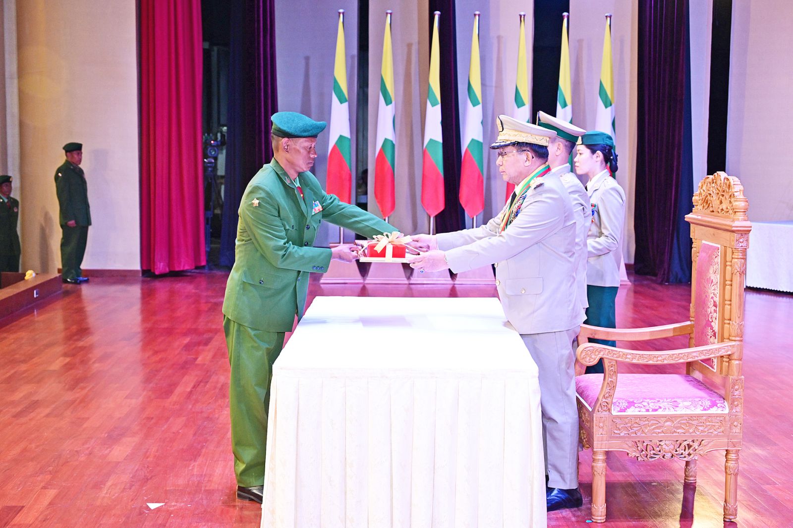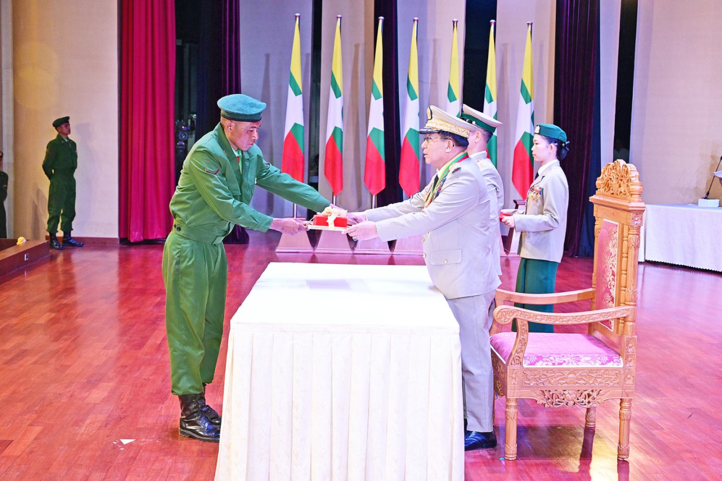 ယင်းနောက် နိုင်ငံတော်လုံခြုံရေးနှင့် အေးချမ်းသာယာရေးကော်မရှင်ဥက္ကဋ္ဌ တပ်မတော်ကာကွယ်ရေးဦးစီးချုပ်က သူရဲကောင်းမှတ်တမ်းဝင်တံဆိပ်ရရှိသူ ဗိုလ်မှူးကြီး ၇ ဦး၊ ဒုတိယဗိုလ်မှူးကြီး ၆ ဦး၊ ဗိုလ်မှူး ၁၄ ဦး၊ ဗိုလ်ကြီး ၄ ဦး၊ ဗိုလ် ၁ ဦး၊ ဒုတိယအရာခံဗိုလ် ၄ ဦး၊ အုပ်ခွဲတပ်ကြပ်ကြီး ၁ ဦး၊ တပ်ကြပ်ကြီး ၃ ဦး၊ တပ်ကြပ် ၅ ဦး၊ ဒုတိယတပ်ကြပ် ၆ ဦးတို့အား ဆုတံဆိပ်များ အသီးသီးပေးအပ်ချီးမြှင့်သည်။