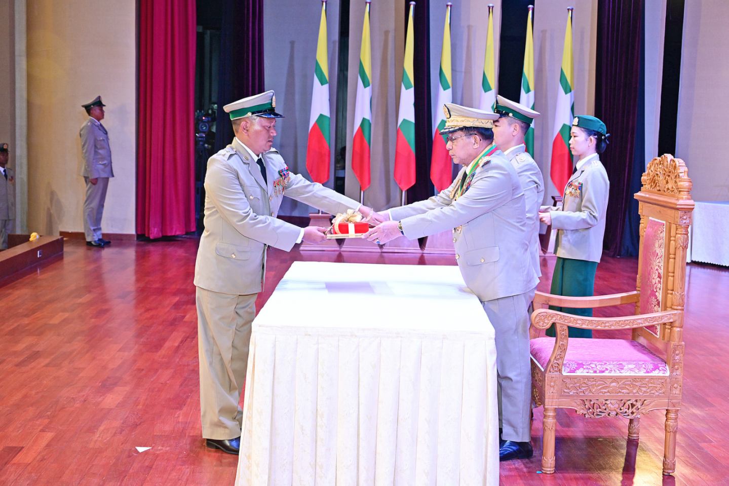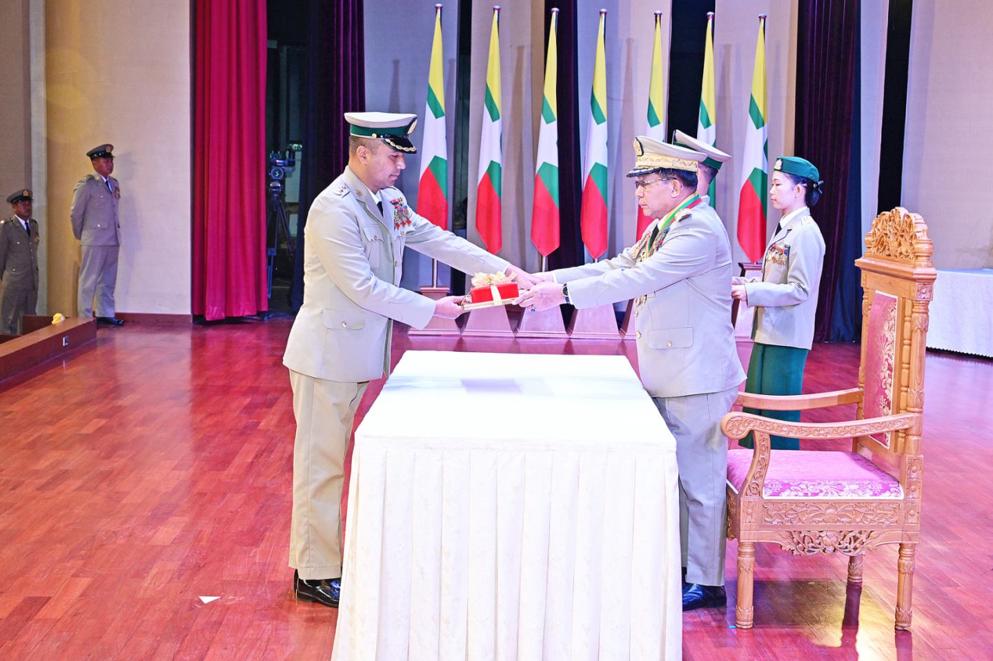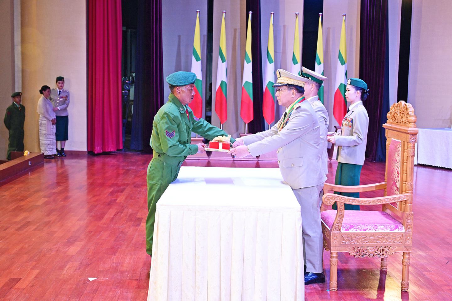 ယင်းနောက် နိုင်ငံတော်လုံခြုံရေးနှင့် အေးချမ်းသာယာရေးကော်မရှင်ဥက္ကဋ္ဌ တပ်မတော်ကာကွယ်ရေးဦးစီးချုပ်က သူရဲကောင်းမှတ်တမ်းဝင်တံဆိပ်ရရှိသူ ဗိုလ်မှူးကြီး ၇ ဦး၊ ဒုတိယဗိုလ်မှူးကြီး ၆ ဦး၊ ဗိုလ်မှူး ၁၄ ဦး၊ ဗိုလ်ကြီး ၄ ဦး၊ ဗိုလ် ၁ ဦး၊ ဒုတိယအရာခံဗိုလ် ၄ ဦး၊ အုပ်ခွဲတပ်ကြပ်ကြီး ၁ ဦး၊ တပ်ကြပ်ကြီး ၃ ဦး၊ တပ်ကြပ် ၅ ဦး၊ ဒုတိယတပ်ကြပ် ၆ ဦးတို့အား ဆုတံဆိပ်များ အသီးသီးပေးအပ်ချီးမြှင့်သည်။