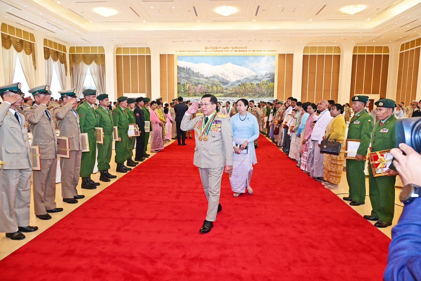 အဆိုပါအခမ်းအနားသို့ နိုင်ငံတော်လုံခြုံရေးနှင့်အေးချမ်းသာယာရေးကော်မရှင်ဥက္ကဋ္ဌ တပ်မတော်ကာကွယ်ရေးဦးစီးချုပ်နှင့်အတူဇနီး ဒေါ်ကြူကြူလှ၊ ကော်မရှင်ဒုတိယဥက္ကဋ္ဌ ဒုတိယတပ်မတော်ကာကွယ်ရေးဦးစီးချုပ် ကာကွယ်ရေးဦးစီးချုပ်(ကြည်း) ဒုတိယဗိုလ်ချုပ်မှူးကြီး သီရိပျံချီမဟာသရေစည်သူစိုးဝင်း၊ ကော်မရှင်အဖွဲ့ဝင် နိုင်ငံတော်ဝန်ကြီးချုပ် ဇေယျကျော်ထင် သရေစည်သူ ဦးညိုစောနှင့် ဇနီး၊ ကော်မရှင်အဖွဲ့ဝင် အမှုဆောင်ချုပ်နှင့်ဇနီး၊ ကော်မရှင်အတွင်းရေးမှူးနှင့်ဇနီး၊ ကော်မရှင်အဖွဲ့ဝင်များနှင့်ဇနီးများ၊ ကာကွယ်ရေးဦးစီးချုပ်ရုံးမှ အဆင့်မြင့် တပ်မတော်အရာရှိကြီးများနှင့် ဇနီးများ၊ ပြည်ထောင်စုအဆင့်ပုဂ္ဂိုလ်များ၊ ပြည်ထောင်စုဝန်ကြီးများနှင့် ဇနီးများ၊ တပ်မတော်စွမ်းရည်သတ္တိဆိုင်ရာ ဂုဏ်ထူးဆောင်တံဆိပ်လက်ခံရယူကြမည့် အရာရှိ၊ စစ်သည်များနှင့် အမွေခံများ တက်ရောက်ကြသည်။