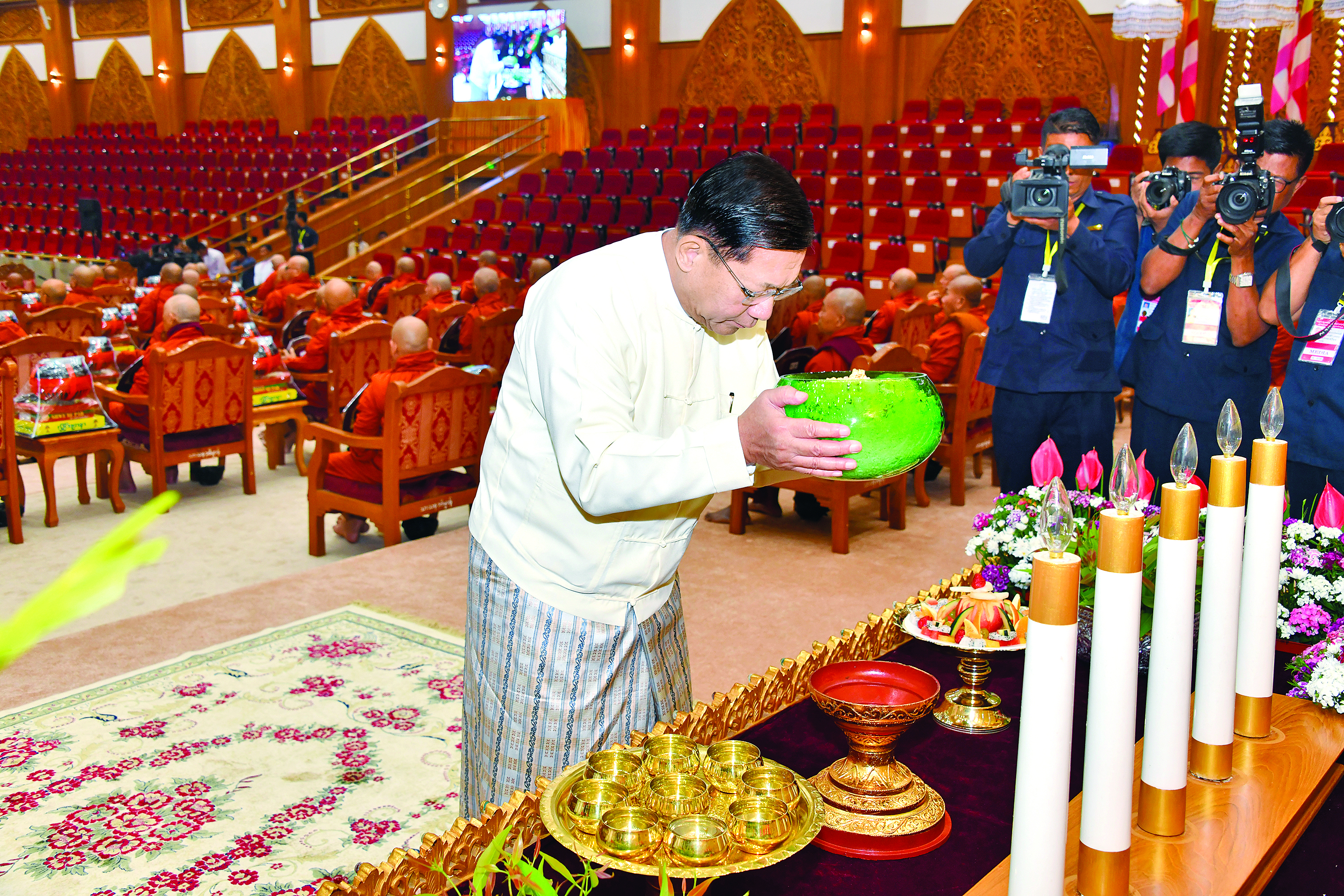 အခမ်းအနားမစတင်မီ နိုင်ငံတော်ယာယီသမ္မတ နိုင်ငံတော်လုံခြုံရေးနှင့် အေးချမ်းသာယာရေးကော်မရှင်ဥက္ကဋ္ဌက အဂ္ဂါဓိပတိသာသနာ့ ဗိမာန်တော်ကြီး အတွင်းရှိ မာရဝိဇယနောင်တော်ကြီး ဗုဒ္ဓရုပ်ပွားတော်မြတ်အား မြသပိတ်ဆွမ်းတော်၊ သစ်သီး၊ ပန်းမန်၊ သောက်တော်ရေချမ်းနှင့် ဆီမီးကပ်လှူပူဇော်သည်။
