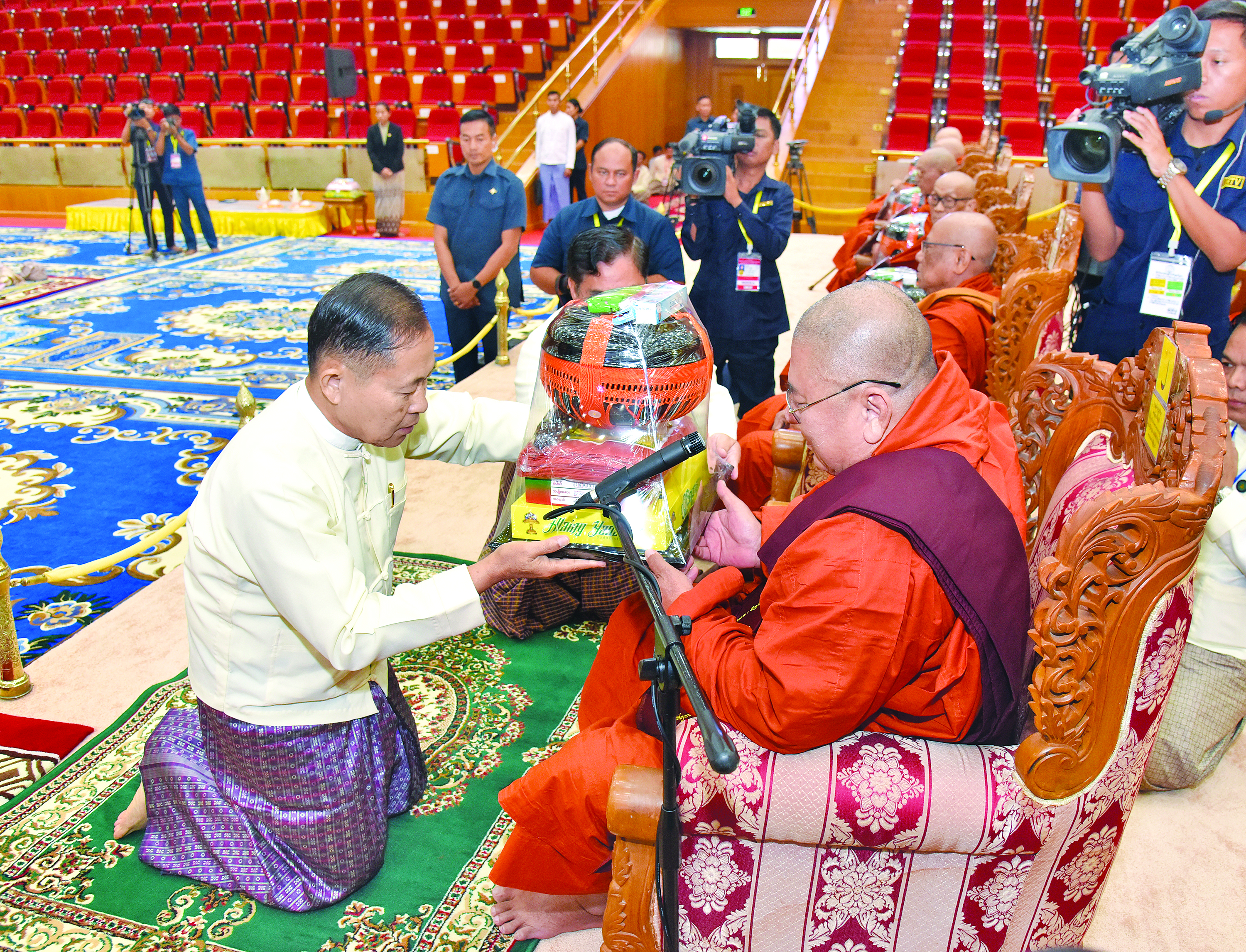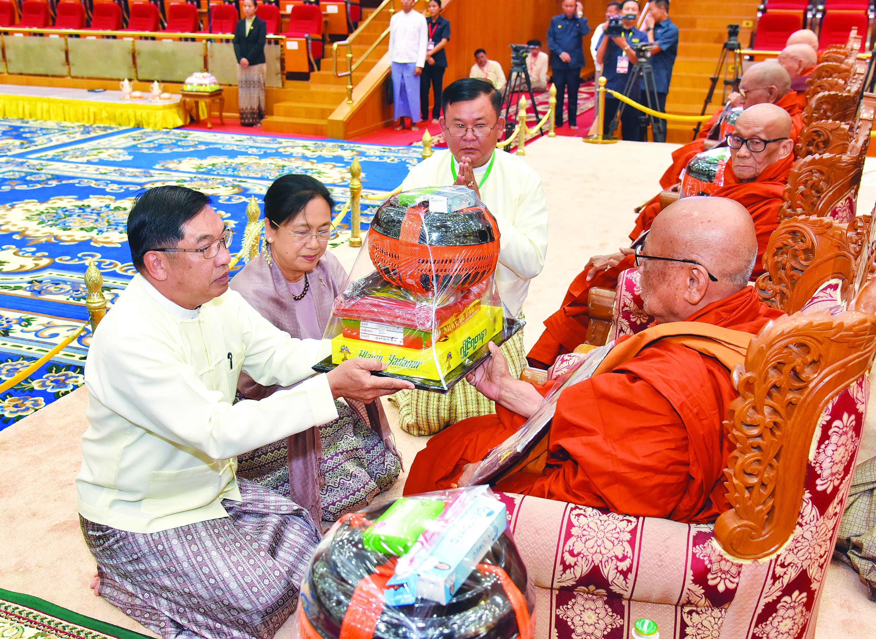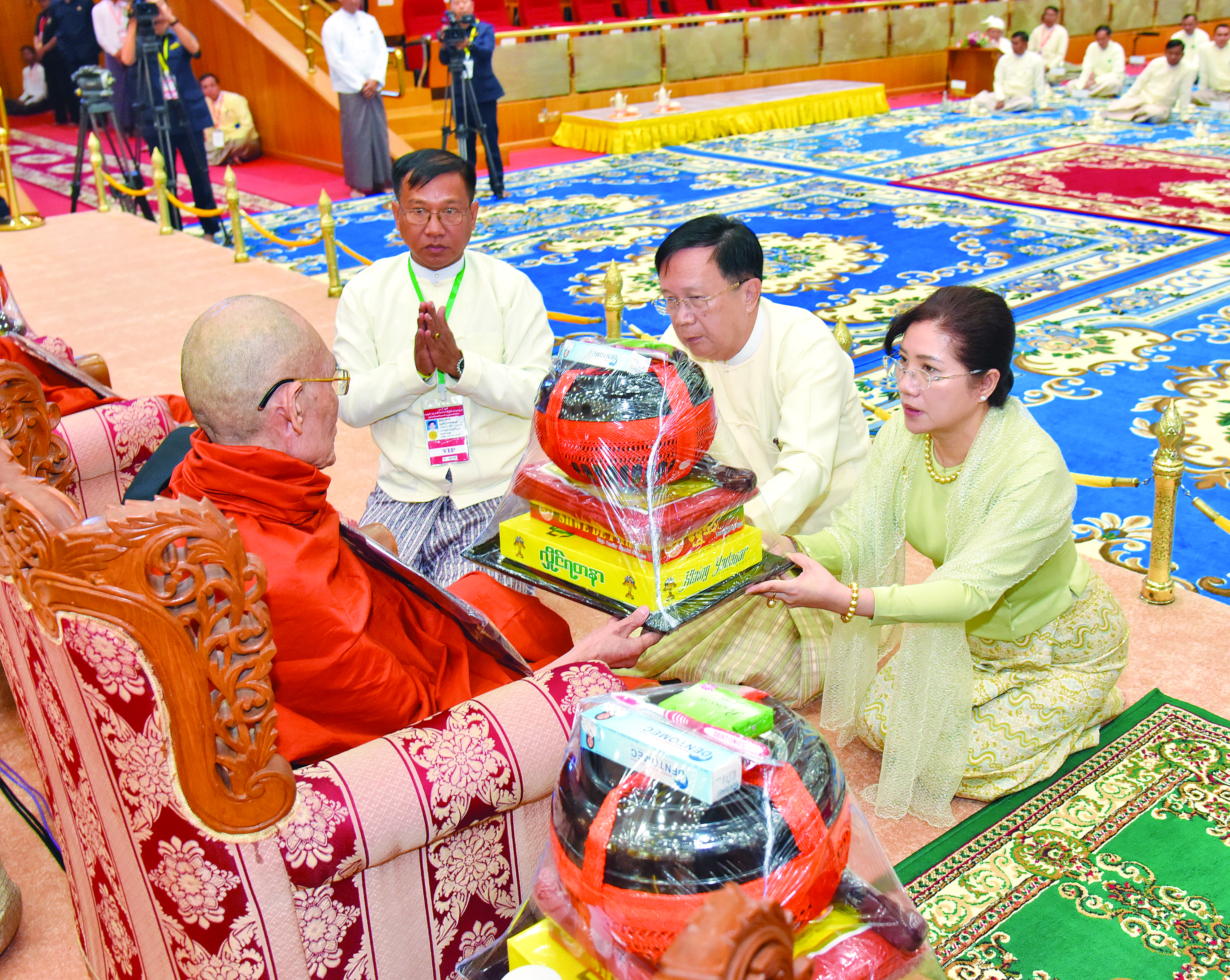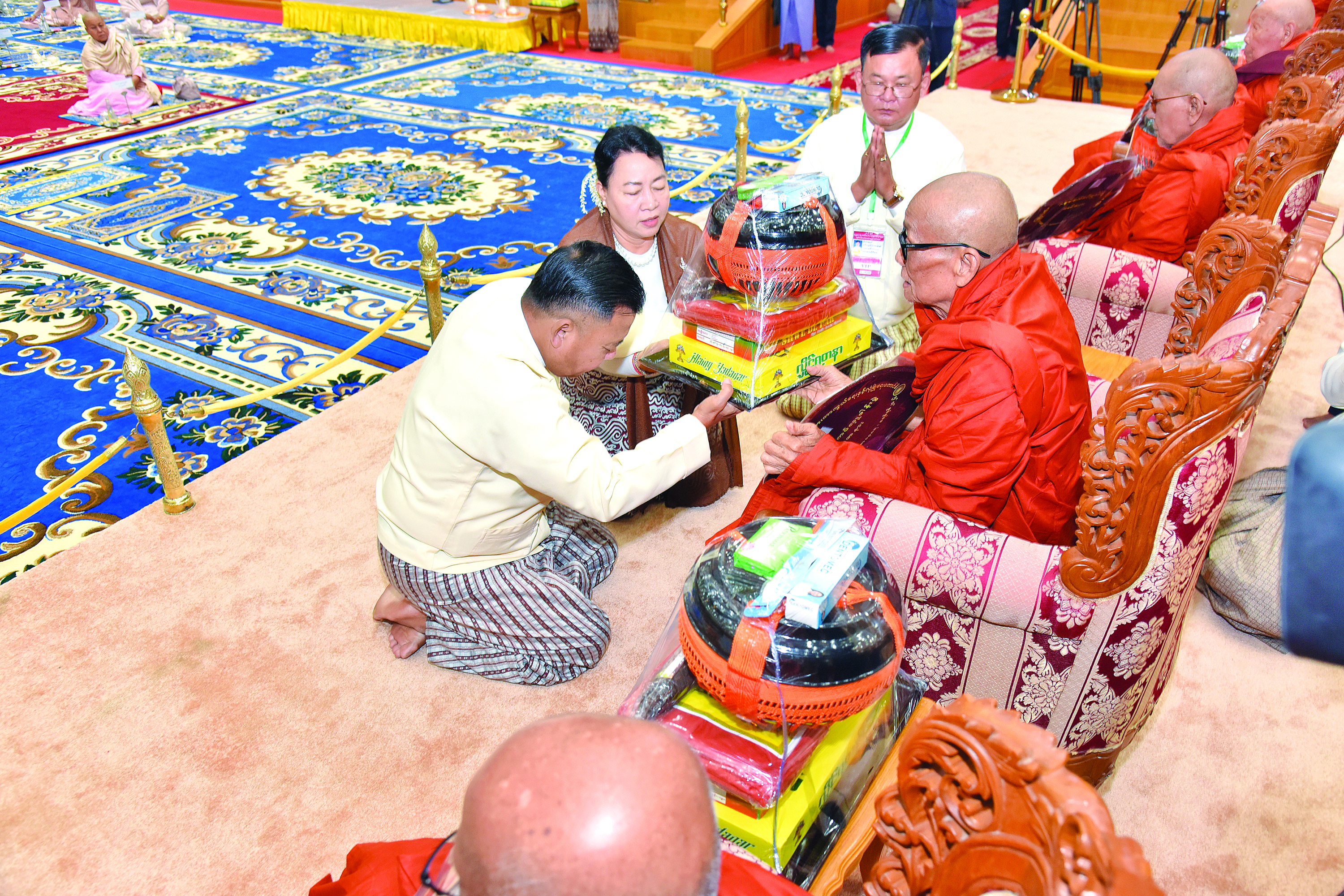 ယင်းနောက် နိုင်ငံတော်ယာယီသမ္မတ နိုင်ငံတော်လုံခြုံရေးနှင့် အေးချမ်းသာယာ ရေးကော်မရှင်ဥက္ကဋ္ဌ နှင့်ဇနီးတို့က နိုင်ငံတော်သံဃမဟာနာယကအဖွဲ့ ဥက္ကဋ္ဌ၊ သန်လျင် မင်းကျောင်းဆရာတော်ဘုရားကြီးထံသို့လည်းကောင်း၊ ကော်မရှင်ဒုတိယဥက္ကဋ္ဌက နိုင်ငံတော်သံဃမဟာနာယကအဖွဲ့ အကျိုးတော်ဆောင်၊ မန္တလေးမြို့၊ မစိုးရိမ်တိုက်သစ် မဟာနာယကဆရာတော်ကြီးထံသို့လည်းကောင်း၊ ကော်မရှင်အဖွဲ့ဝင် နိုင်ငံတော် ဝန်ကြီးချုပ်နှင့်ဇနီး၊ ကော်မရှင်အဖွဲ့ဝင် အမှုဆောင်ချုပ်နှင့်ဇနီး၊ ကော်မရှင်အတွင်း ရေးမှူးနှင့်ဇနီး၊ ကော်မရှင်အဖွဲ့ဝင်များနှင့်ဇနီးများ၊ အခမ်းအနားသို့တက်ရောက်လာသည့် အကြီးအကဲများက သာသနာတော်ဆိုင်ရာဘွဲ့တံဆိပ်တော် ဆက်ကပ်ခံယူ မည့်ဆရာတော်ကြီးများထံသို့လည်းကောင်း လှူဖွယ်ဝတ္ထုပစ္စည်းများကို ဆက်ကပ် လှူဒါန်းကြသည်။