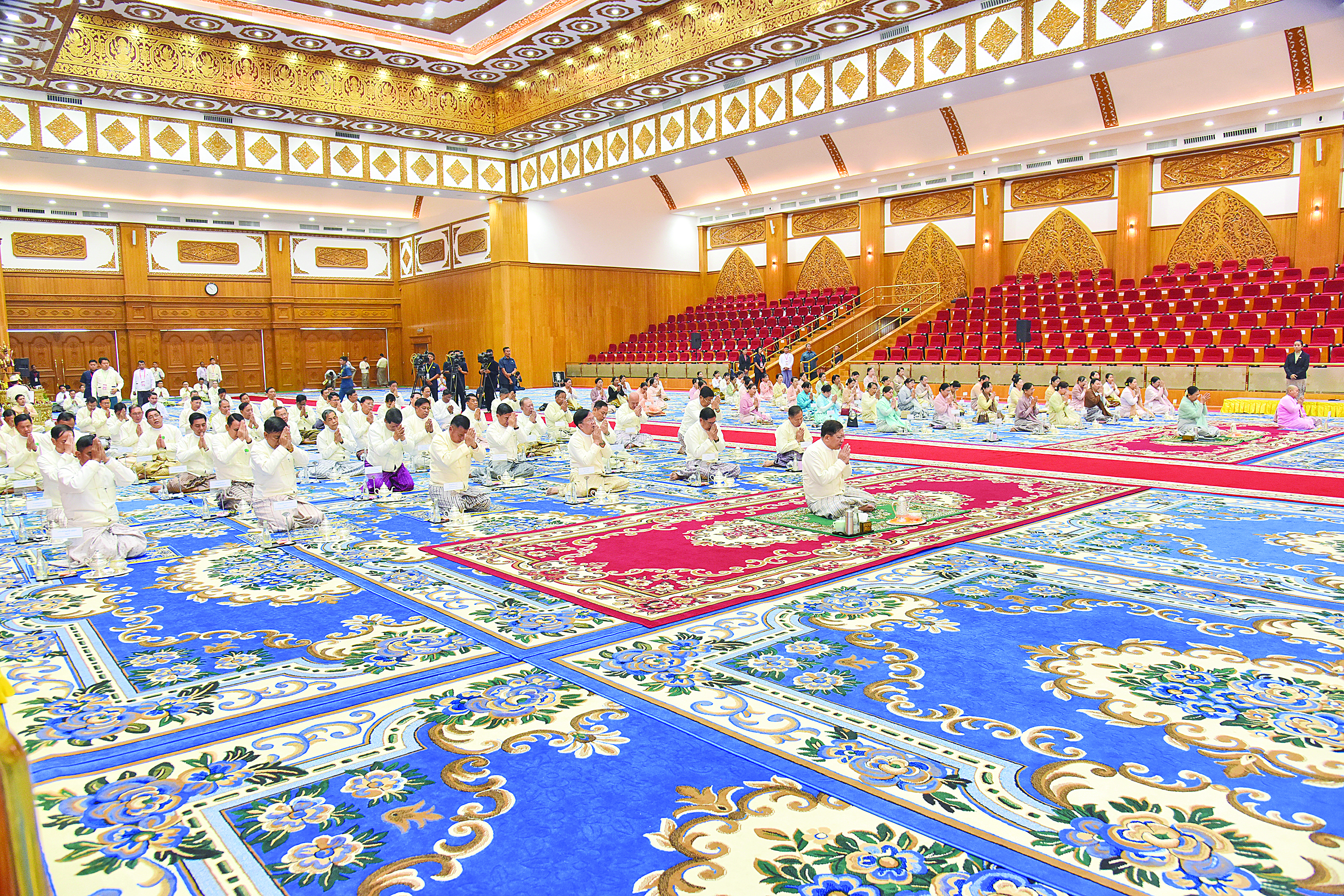 ထို့နောက် အခမ်းအနားကို “နမော တဿ” သုံးကြိမ်ရွတ်ဆို ဘုရားကန်တော့ ဖွင့်လှစ်၍ နိုင်ငံတော်ယာယီသမ္မတနိုင်ငံတော်လုံခြုံရေးနှင့် အေးချမ်းသာယာရေး ကော်မရှင်ဥက္ကဋ္ဌနှင့်ဇနီး အမှူးပြုသော ဧည့်ပရိသတ်များက နိုင်ငံတော်သံဃမဟာ နာယကအဖွဲ့ဥက္ကဋ္ဌ သန်လျင်မင်းကျောင်းဆရာတော်ဘုရားကြီးထံမှ ငါးပါးသီလခံယူ ဆောက်တည်ကြပြီး သံဃာတော်အရှင်သူမြတ်များရွတ်ပွားသရဇ္ဈာယ်တော်မူသော မေတ္တသုတ်ပရိတ်တရားတော်များကို နာယူကြည်ညိုကြသည်။