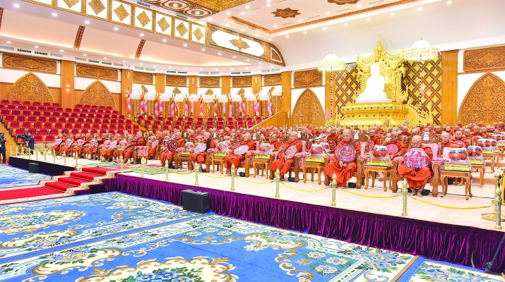 ၂၀၂၆ ခုနှစ်၊ သာသနာတော်ဆိုင်ရာဘွဲ့တံဆိပ်တော် ဆက်ကပ်ခံယူတော်မူမည့် ဆရာတော်ကြီးများအား နေ့ဆွမ်းဆက်ကပ်လှူဒါန်းခြင်းကို ယနေ့နံနက်ပိုင်းတွင် နေပြည်တော်၊ မာရဝိဇယဗုဒ္ဓဥယျာဉ်တော်ပရိဝုဏ်အတွင်းရှိ အဂ္ဂါဓိပတိသာသနာ့ဗိမာန်တော်ကြီး၌ကျင်းပရာ ပြည်ထောင်စုသမ္မတမြန်မာနိုင်ငံတော် ယာယီသမ္မတ နိုင်ငံတော်လုံခြုံရေးနှင့်အေးချမ်းသာယာရေးကော်မရှင်ဥက္ကဋ္ဌ ဗိုလ်ချုပ်မှူးကြီးမင်းအောင်လှိုင်နှင့်ဇနီး ဒေါ်ကြူကြူလှတို့တက်ရောက်၍ နေ့ဆွမ်းဆက်ကပ်လှူဒါန်းသည်။