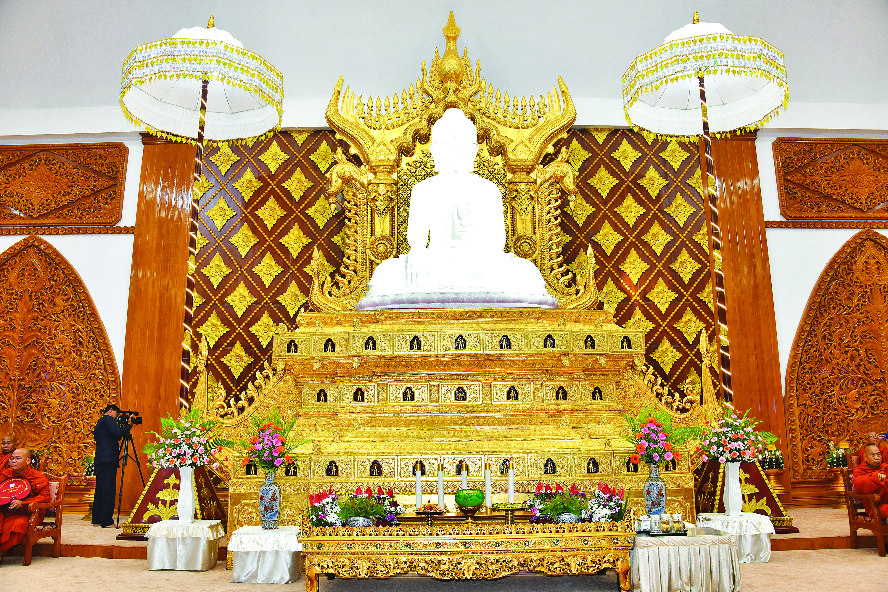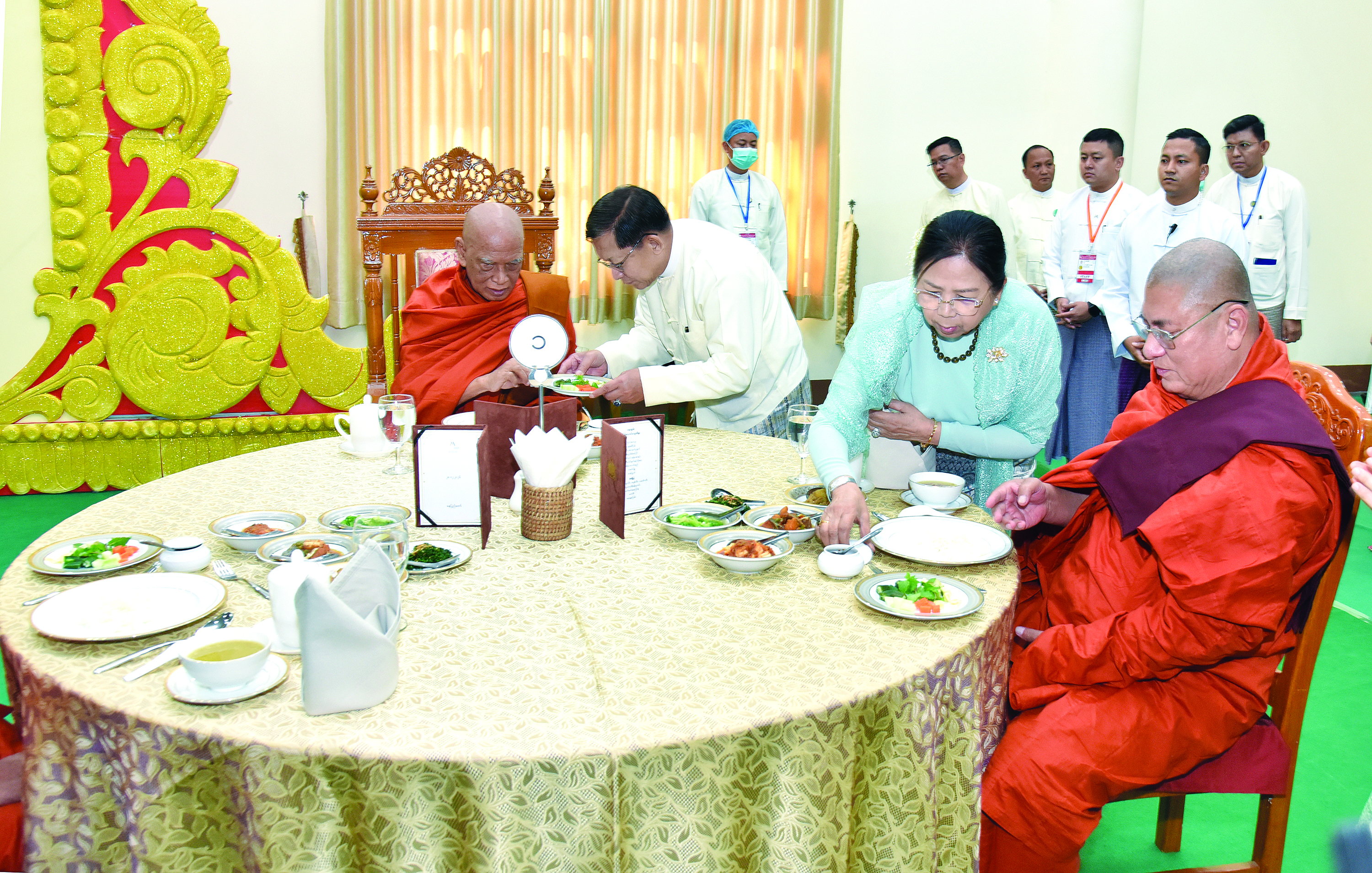 အခမ်းအနားသို့ အထူးပင့်ဖိတ်ထားသည့် နိုင်ငံတော်သံဃမဟာနာယကအဖွဲ့ဥက္ကဋ္ဌ အဘိဓဇမဟာရဋ္ဌဂုရု အဂ္ဂမဟာသဒ္ဓမ္မဇောတိကဓဇ သန်လျင်မင်းကျောင်းဆရာတော် ဒေါက်တာဘဒ္ဒန္တစန္ဒိမာဘိဝံသနှင့် နိုင်ငံတော်သံဃမဟာနာယကအဖွဲ့အကျိုးတော်ဆောင်၊ မန္တလေးမြို့၊မစိုးရိမ်တိုက်သစ်မဟာနာယက၊ ဓမ္မသမိဒ္ဓိကျောင်းဆရာတော် အဂ္ဂမဟာပဏ္ဍိတ အဂ္ဂမဟာသဒ္ဓမ္မဇောတိကဓဇ မဟာဓမ္မကထိက ဗဟုဇနဟိတဓရ ဘဒ္ဒန္တ ဝါသေဋ္ဌာဘိဝံသတို့အမှူးပြုသည့် ပြည်တွင်း၊ ပြည်ပဘွဲ့ခံ ဆရာတော်ကြီး ၁၄၆ ပါးနှင့် ဘွဲ့ခံသီလရှင်ဆရာကြီး ၁ ပါး ကြွရောက်ချီးမြှင့်တော်မူကြ ပြီး နိုင်ငံတော်ယာယီသမ္မတနိုင်ငံတော်လုံခြုံရေးနှင့် အေးချမ်းသာယာရေးကော်မရှင် ဥက္ကဋ္ဌနှင့် ဇနီးတို့နှင့်အတူ ကော်မရှင်ဒုတိယဥက္ကဋ္ဌ ဒုတိယဗိုလ်ချုပ်မှူးကြီး စိုးဝင်း၊ ကော်မရှင်အဖွဲ့ဝင် နိုင်ငံတော်ဝန်ကြီးချုပ်ဦးညိုစောနှင့်ဇနီး၊ ကော်မရှင်အဖွဲ့ဝင် အမှုဆောင်ချုပ် ဦးအောင်လင်းဒွေးနှင့်ဇနီး၊ ကော်မရှင်အတွင်း ရေးမှူးဗိုလ်ချုပ်ကြီးရဲဝင်းဦးနှင့်ဇနီး၊ ကော်မရှင်အဖွဲ့ဝင်များနှင့်ဇနီးများ၊ ပြည်ထောင်စုအဆင့်ပုဂ္ဂိုလ်များ၊ ပြည်ထောင်စုဝန်ကြီးများနှင့် ဇနီးများ၊ နေပြည်တော်ကောင်စီဥက္ကဋ္ဌ၊ ကာကွယ်ရေးဦးစီးချုပ်ရုံးမှ အဆင့်မြင့်တပ်မတော်အရာရှိကြီးများနှင့် ဇနီးများ၊ နေပြည်တော်တိုင်းစစ်ဌာနချုပ် တိုင်းမှူးနှင့် တာဝန်ရှိသူများ တက်ရောက်ကြည်ညိုကြသည်။