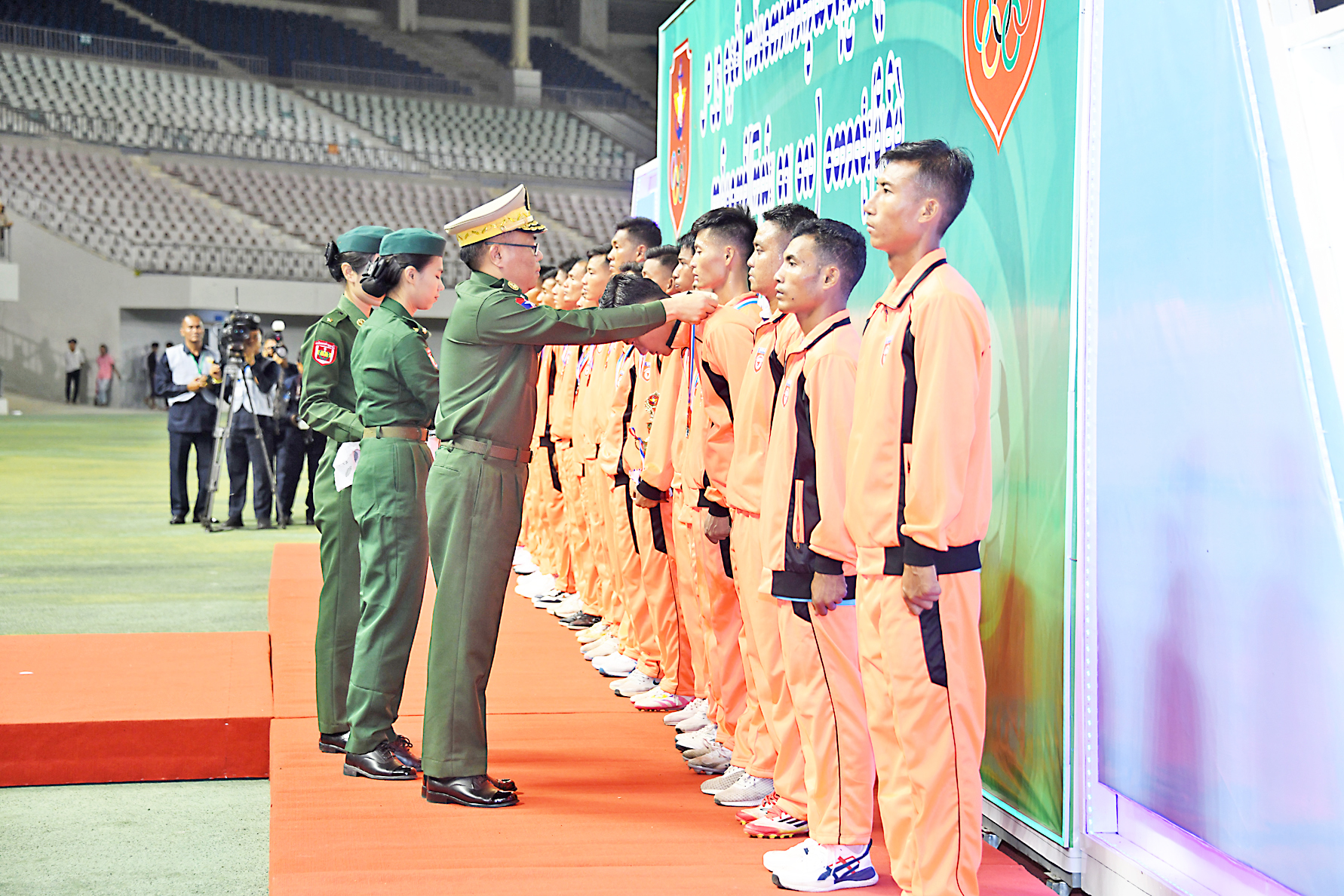 Final and prize-giving ceremony of the 62nd Commander-in-Chief of Defence Services’ Trophy Tatmadaw (Army, Navy and Air) Football Tournament for 2025 was held at Zeyathiri Tatmadaw Sports Stadium in Nay Pyi Taw this evening. Chairman of State Security and Peace Commission of the Republic of the Union of Myanmar, Commander-in-Chief of Defence Services, Senior General Min Aung Hlaing watched the match and presented prizes.