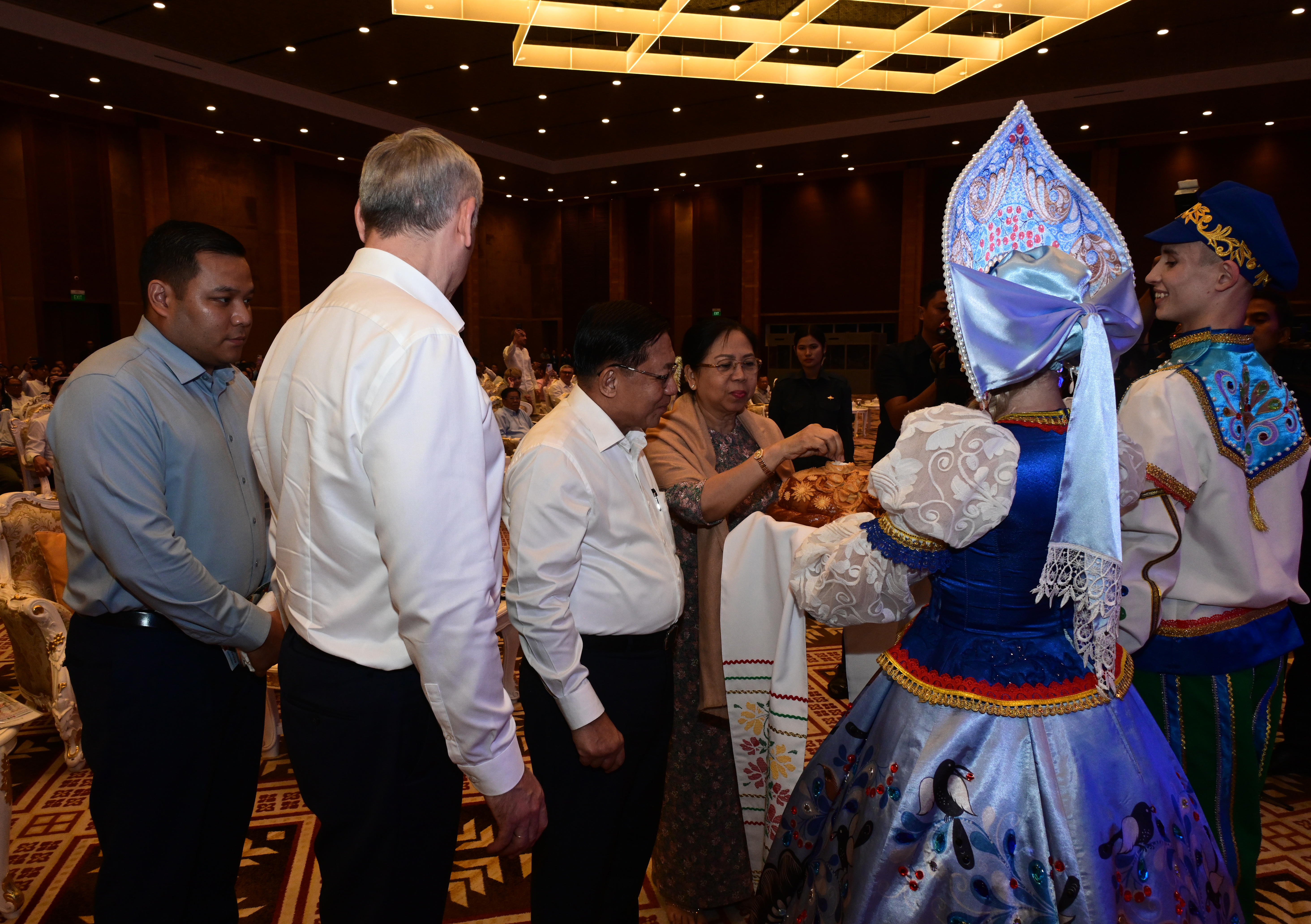 The Ensemble staged Russian traditional songs and Siberian music and songs harmoniously based on rich classic styles and traditional styles through elegant movements. After presenting the song “Bread is everything”, artists of the Ensemble served the Senior General and wife with bread and salt in accord with Russian tradition, as an expression of thanks for the hospitality and friendship and to share the joys.