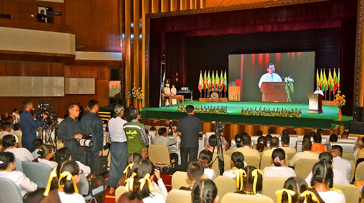 The prize-giving ceremony of the Diamond Jubilee examination on the 38 Blessings of Mingala Sutta and Life of Buddha of the Young Men’s Buddhist Association (YMBA) (Central) took place at Zeyathiri Villa at Konmyinttha, Yangon, this morning. Acting President of the Republic of the Union of Myanmar, Chairman of State Security and Peace Commission Life-Long Honorary Patron of YMBA Senior General Min Aung Hlaing attended the ceremony and gave away prizes.