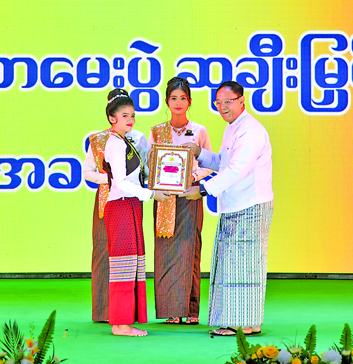 The Senior General presented first prizes to winners in the Myanmar language (senior), Pa-O language (senior)and Mon language (junior) of the 75th Anniversary (Diamond Jubilee) 38 Blessings and Buddhism Examination organized by YMBA.