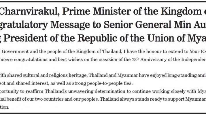 On behalf of the Royal Thai Government and the people of the Kingdom of Thailand, I have the honour to extend to Your Excellency and, through you, to the people of Myanmar our sincere congratulations and best wishes on the occasion of the 78th Anniversary of the Independence Day of the Republic of the Union of Myanmar.