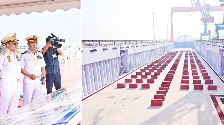 နေပြည်တော် မတ် ၈ တပ်မတော်(ရေ)မှ ရေတပ်သင်္ဘောကျင်းဌာနချုပ် တန် ၄၀၀၀၀ ရေလုံလွန်းကျင်း ဖွင့်ပွဲအခမ်းအနား၊ ရေငုပ်သင်္ဘောတိုက်ဖျက်ရေးရေယာဉ်များ၏ ဧရာခင်းမင်္ဂလာအခမ်းအနားနှင့်စစ်ရေယာဉ်များတပ်တော်ဝင်ခြင်းအခမ်းအနားများအား ယနေ့နံနက်ပိုင်းတွင် သန်လျင်တပ်နယ်၊ ရေတပ်သင်္ဘောကျင်းဌာနချုပ် တန် ၄၀၀၀၀ ရေလုံလွန်းကျင်းတည်ဆောက်ရေးအလုပ်ရုံနှင့် ရေတပ်ဆိပ်ခံတံတားတို့၌ကျင်းပရာ နိုင်ငံတော်လုံခြုံရေးနှင့်အေးချမ်းသာယာရေးကော်မရှင်ဥက္ကဋ္ဌ တပ်မတော်ကာကွယ်ရေးဦးစီးချုပ် ဗိုလ်ချုပ်မှူးကြီးမင်းအောင်လှိုင် တက်ရောက်ချီးမြှင့်သည်။ အဆိုပါအခမ်းအနားများသို့ နိုင်ငံတော်လုံခြုံရေးနှင့်အေးချမ်းသာယာရေးကော်မရှင်ဥက္ကဋ္ဌ တပ်မတော်ကာကွယ်ရေးဦးစီးချုပ် ဗိုလ်ချုပ်မှူးကြီးမင်းအောင်လှိုင်နှင့်အတူကော်မရှင်အတွင်းရေးမှူး