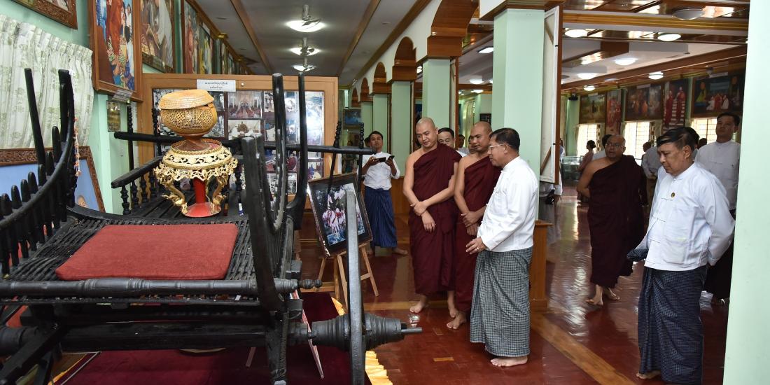 ထုိ႔ေနာက္ မင္းကြန္းတိပိဋကဓရ ဆရာေတာ္ဘုရားႀကီး၏ သက္ေတာ္ရာျပည့္ အထိမ္းအမွတ္ မင္းကြန္းတိပိဋက ရာျပည့္ေက်ာင္းေတာ္သုိ႔ေရာက္ရွိၾကၿပီး မင္းကြန္း တိပိဋကဆရာေတာ္ဘုရားႀကီး၏ ပုံတူ႐ုပ္တုေတာ္မ်ားႏွင့္ သာသနာေရးဆုိင္ရာ ေဆာင္ရြက္ခ်က္မွတ္တမ္းဓာတ္ပုံမ်ားအား လွည့္လည္ ၾကည့္႐ႈသည္။ ယင္းေနာက္ ဆရာေတာ္ႀကီး သီတင္းသုံးေတာ္မူခဲ့သည့္ မဟာဗုဒၶ၀င္ မင္းကြန္းေထရ္အရွင္က်မ္းျပဳေက်ာင္းေတာ္ႀကီးသုိ႔ေရာက္ရွိၿပီး ဆရာေတာ္ႀကီး၏ ပုံတူ႐ုပ္တုေတာ္ အားဖူးေျမာ္၍ ဆရာေတာ္ႀကီး သက္ရွိထင္ရွားရွိစဥ္ကအသုံးျပဳခဲ့သည့္ အသုံးအေဆာင္ပစၥည္းမ်ား၊ ရရွိခဲ့သည့္သာသနာေရး ဆုိင္ရာဘြဲ႕တံဆိပ္ေတာ္မ်ား၊ ဆရာေတာ္ႀကီးကုိယ္တုိင္ေရးသားခဲ့သည့္ က်မ္း စာေပမ်ားႏွင့္ ဆရာေတာ္ႀကီးသီတင္းသုံးေတာ္မူခဲ့သည့္ ပုံတူ႐ုပ္တုမ်ားအားၾကည့္႐ႈၿပီး တပ္မေတာ္ ကာကြယ္ေရးဦးစီးခ်ဳပ္က ေက်ာင္းေတာ္ႀကီးေရရွည္တည္တံ့ခုိင္ၿမဲေစေရးအတြက္ ထိန္းသိမ္း ေဆာင္ရြက္ရန္၊ မီးေဘးအႏၲရာယ္ကင္းရွင္းေစေရးစီမံေဆာင္ရြက္ေပးရန္၊ ဆရာေတာ္ႀကီး၏ ပုံတူ႐ုပ္တုမ်ားအားၾကာရွည္ခံသည့္ ဆီလီကြန္႐ုပ္တုမ်ားျဖင့္ အစားထုိး ေဆာင္ရြက္ေပးရန္ႏွင့္ ဆရာေတာ္ႀကီး၏ ေထ႐ုပၸတၱိဓာတ္ပုံမွတ္တမ္းစာအုပ္မ်ား ျပဳစုထုတ္ေ၀ရန္တုိ႔အားမွာၾကားသည္။