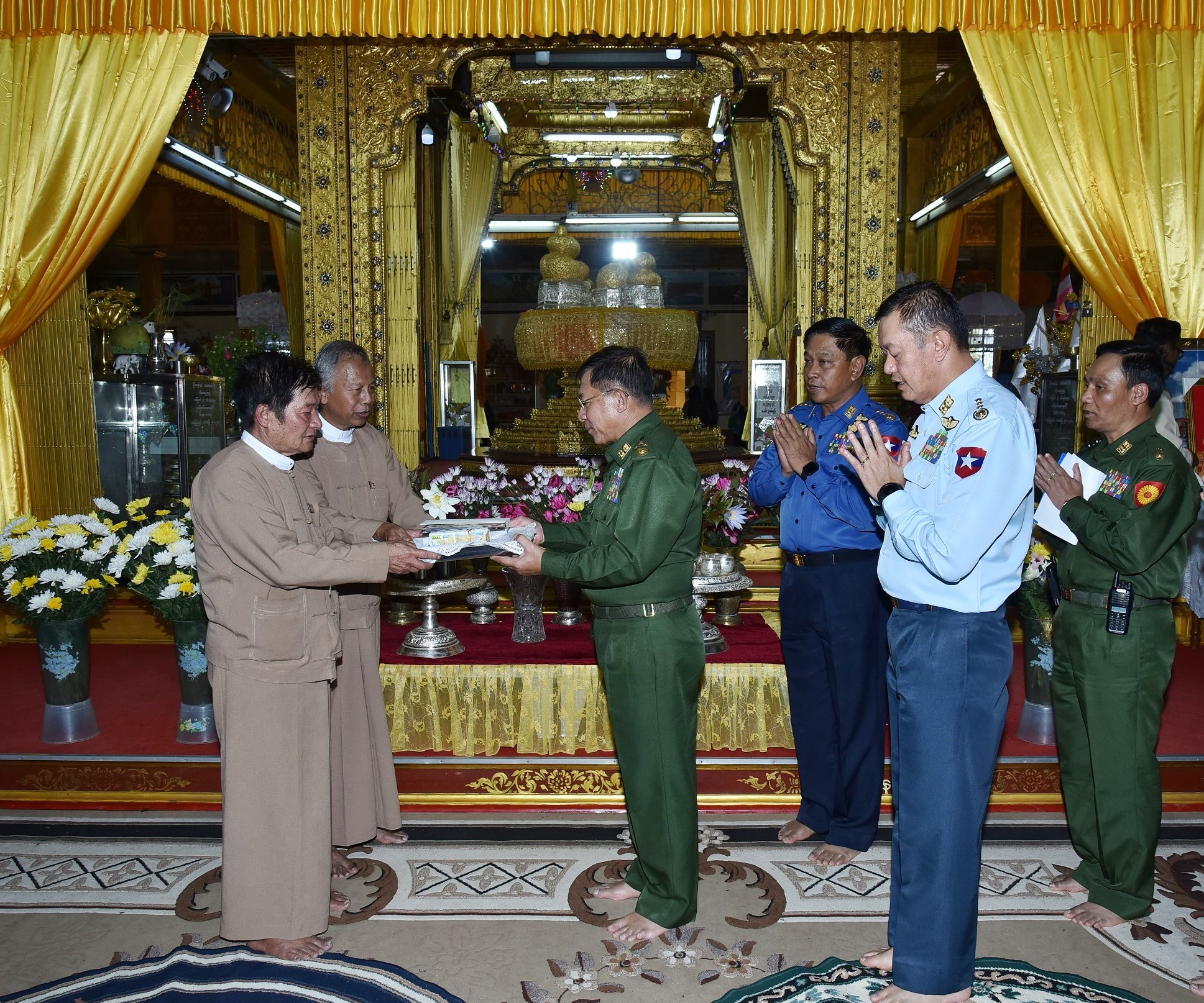 ယင္းေနာက္ တပ္မေတာ္ကာကြယ္ေရးဦးစီးခ်ဳပ္က ေဖာင္ေတာ္ဦးေစတီေတာ္ႀကီး ဘက္စုံျပဳျပင္မြမ္းမံ ထိန္းသိမ္းရန္အတြက္ အလွဴေငြမ်ားအား ေဂါပကအဖြဲ႕ထံေပးအပ္လွဴဒါန္းရာ ေဂါပကအဖြဲ႕မွ အင္းေလးေဖာင္ေတာ္ဦးဘုရားပုံေတာ္ႏွင့္ ေဖာင္ေတာ္ဦးဘုရား ေဒသစာရီၾကြခ်ီေတာ္မူသည့္ ဓာတ္ပုံ ကားခ်ပ္မ်ားအား ဓမၼလက္ေဆာင္အျဖစ္ျပန္လည္ ေပးအပ္သည္။ ထုိ႔ေနာက္ တပ္မေတာ္ ကာကြယ္ေရးဦးစီးခ်ဳပ္ႏွင့္အဖြဲ႕၀င္မ်ားသည္ နမ့္ဟူးေက်ာင္း၌ ႏုိင္ငံေတာ္ၾသ၀ါဒစရိယ အင္းေလး၊ အင္းၿခံေက်ာင္းဆရာေတာ္ ဘဒၵႏၲနေႏၲာဘာသ အမွဴးျပဳေသာ ဆရာေတာ္ႀကီးမ်ားအား ဖူးေျမာ္ ၾကည္ညိဳ၍ လွဴဖြယ္ပစၥည္းမ်ားႏွင့္ န၀ကမၼအလွဴေငြမ်ားဆက္ကပ္လွဴဒါန္းၾကၿပီး ငါးပါးသီလခံယူ ေဆာက္တည္ၾကသည္။ ယင္းေနာက္ လွဴဒါန္းမႈအစုစုတုိ႔အတြက္ ေရစက္သြန္းခ်အမွ်ေပးေ၀ၾကသည္။