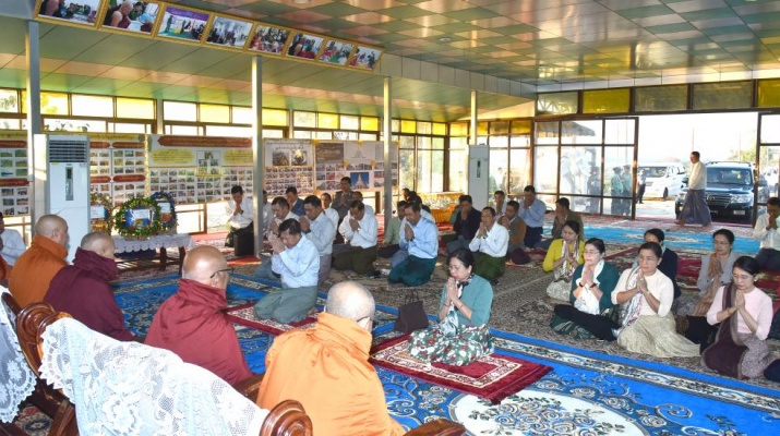 ဆက္လက္ၿပီး တပ္မေတာ္ကာကြယ္ေရးဦးစီးခ်ဳပ္ႏွင့္အဖြဲ႕၀င္မ်ားသည္ ညေနပုိင္း တြင္ ၀ုိင္းေမာ္ၿမိဳ႕နယ္၊ မိုင္းနားေက်းရြာ၊ ေရႊမုိးေတာင္ေပၚရွိ ရဟႏၲာတစ္ေထာင္ ရွင္ပင္ျမတ္စြာ ဆုေတာင္းျပည့္ေစတီ ေတာ္ျမတ္ႀကီးသို႔ေရာက္ရွိၾကၿပီး ေရႊမုိးေတာင္ဓမၼာ႐ုံ၌ ျပည္နယ္သံဃနာယကအဖြဲ႕အက်ိဳးေတာ္ေဆာင္၊ ျမစ္ႀကီးနား ၿမိဳ႕၊ ဓမၼရကၡိတ၀န္းသုိ ေက်ာင္းတုိက္ ဆရာေတာ္အဂၢမဟာပႏၲိတ ဘဒႏၲေကတုမာလာ အမွဴးျပဳေသာ ဆရာေတာ္သံဃာေတာ္မ်ားအား ဖူးေျမာ္ကန္ေတာ့ကာ ငါးပါးသီလခံယူေဆာက္တည္ ၾကၿပီး လွဴဖြယ္ပစၥည္းမ်ားဆက္ကပ္လွဴဒါန္းၾကသည္။ ထုိ႔ေနာက္တပ္မေတာ္ကာကြယ္ေရး ဦးစီးခ်ဳပ္ႏွင့္ဇနီးတို႔သည္ ေရႊမုိးေတာင္ေစတီေတာ္ ျမတ္ႀကီးရွိ ဗုဒၶ႐ုပ္ပြားေတာ္အား ပန္း၊ ေရခ်မ္း၊ ဆီမီးမ်ားကပ္လွဴပူေဇာ္ၾကၿပီး ေစတီေတာ္ႀကီးအား လက္ယာရစ္ လွည့္လည္ဖူးေျမာ္ၾကည္ညိဳခဲ့ၾကသည္။