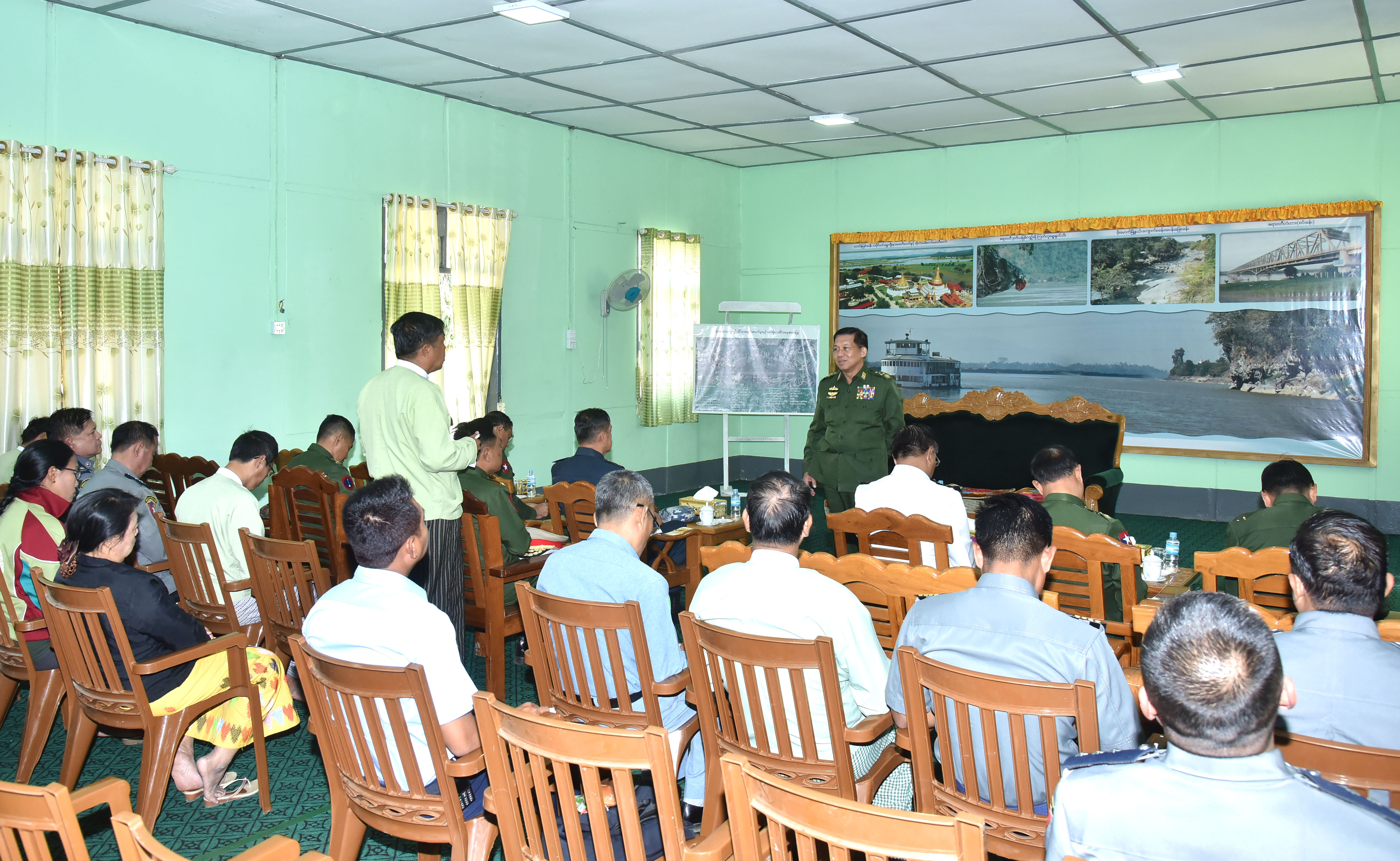 တပ္မေတာ္ကာကြယ္ေရးဦးစီးခ်ဳပ္ ဗုိလ္ခ်ဳပ္မွဴးႀကီးမင္းေအာင္လႈိင္သည္ ယေန႔ နံနက္ပုိင္းတြင္ ေျမာက္ပုိင္းတုိင္း စစ္ဌာနခ်ဳပ္၊ ဗန္းေမာ္တပ္နယ္ရွိ အရာရွိ၊ စစ္သည္၊ မိသားစုမ်ားအား ေတြ႕ဆုံအမွာစကားေျပာၾကားသည္။