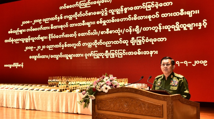 တပ်မတော်ကာကွယ်ရေးဦးစီးချုပ် ဗိုလ်ချုပ်မှူးကြီးမင်းအောင်လှိုင် နေပြည်တော်၊ ဇေယျာသီရိဗိမ္မာန်၌ ကျင်းပပြုလုပ်သည့် ၂၀၁၈/၂၀၁၉ ပညာသင်နှစ် တက္ကသိုလ်ဝင်စာမေးပွဲ၌ ထူးချွန်စွာအောင်မြင်ခဲ့သော စစ်သည်များ၊ တပ်မတော်သားမိသားစုဝင်သားသမီးများ၊ စစ်မှုထမ်းဟောင်းအဖွဲ့ဝင်များ၏ သားသမီးများနှင့် ဘက်စုံပညာထူးချွန်လူငယ်များအား ဂုဏ်ပြုဆုချီးမြှင့်ခြင်း အခမ်းအနား၌ ဂုဏ်ပြုအမှာစကားပြောကြား(ရုပ်သံသတင်း)