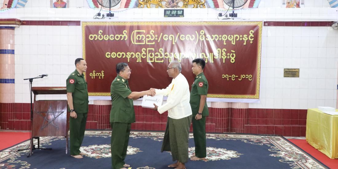 ရန်ကုန်တိုင်း ဒေသကြီး၊ ကျောက်တံတားမြို့နယ်နှင့် မင်္ဂလာတောင်ညွန်မြို့နယ်ရှိ မွတ်ဆလင် ကုသိုလ်ဖြစ်ဆေးရုံ၊ ကတ်သလစ်သီလရှင်လေးများ၏ဘိုးဘွားရိပ်သာ၊ သျှရီသျှရီစန္ဒီမယ်တော် ဟိန္ဒူဘုရား ကျောင်းနှင့် ဇဖါရ်ရှား ဂူဗိမာန်များသို့ တပ်မတော် (ကြည်း၊ ရေ၊ လေ) မိသားစုများနှင့် စေတနာရှင် ပြည်သူများက လှူဒါန်းသည့် ဆန်၊ ဆီ၊ ဆား၊ ပဲနှင့် အလှူငွေများ ပေးအပ်လှူဒါန်း