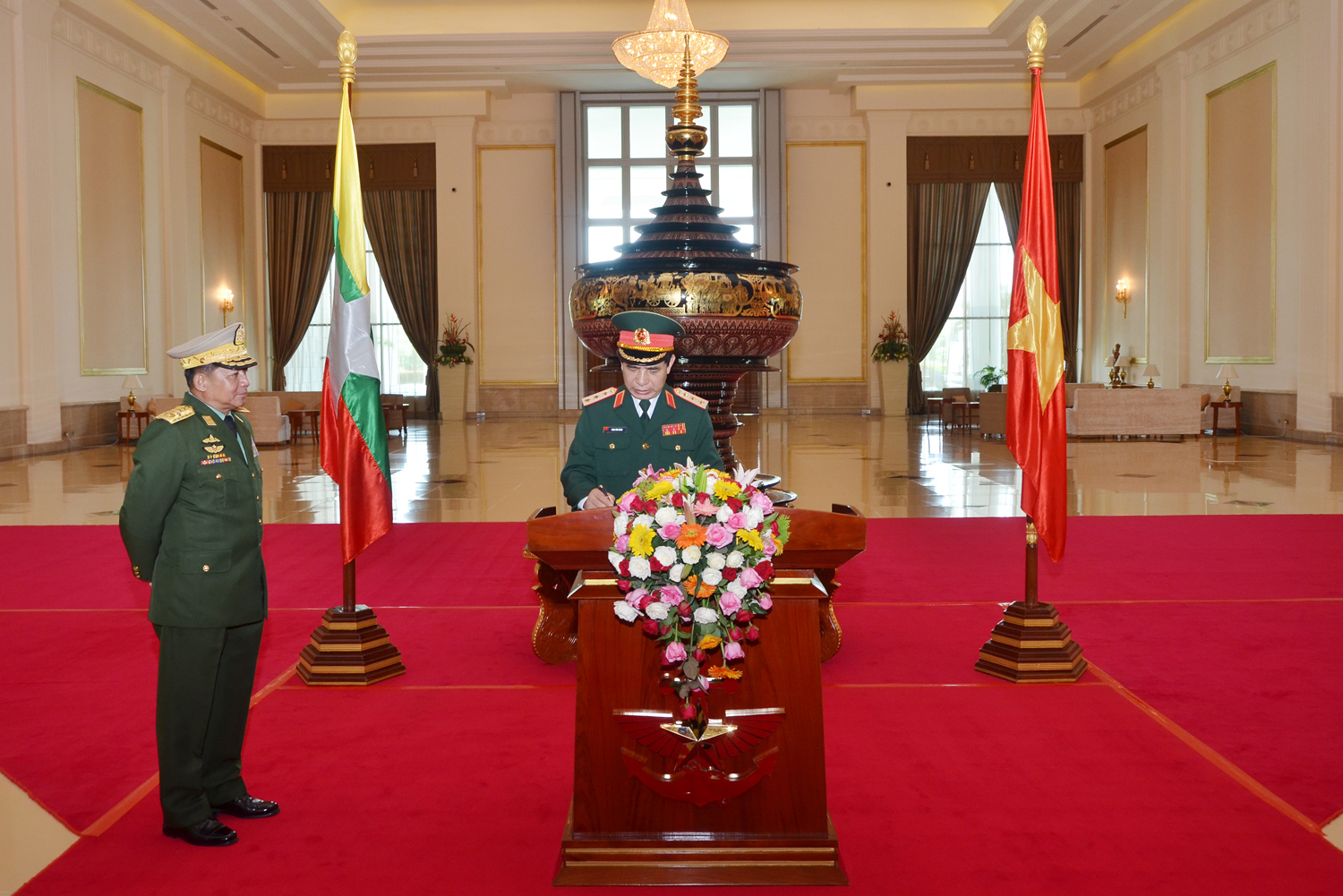 တပ်မတော်ကာကွယ်ရေးဦးစီးချုပ် ဗိုလ်ချုပ်မှူးကြီး မင်းအောင်လှိုင် ဗီယက်နမ်ပြည်သူ့တပ်မတော် စစ်ဦးစီးအရာရှိချုပ် Senior Lieutenant General Phan Van Giang အား ဂုဏ်ပြုကြိုဆို၊ တပ်မတော်နှစ်ရပ် ချစ်ကြည်ရင်းနှီးမှုဆိုင်ရာကိစ္စရပ်များဆွေးနွေး