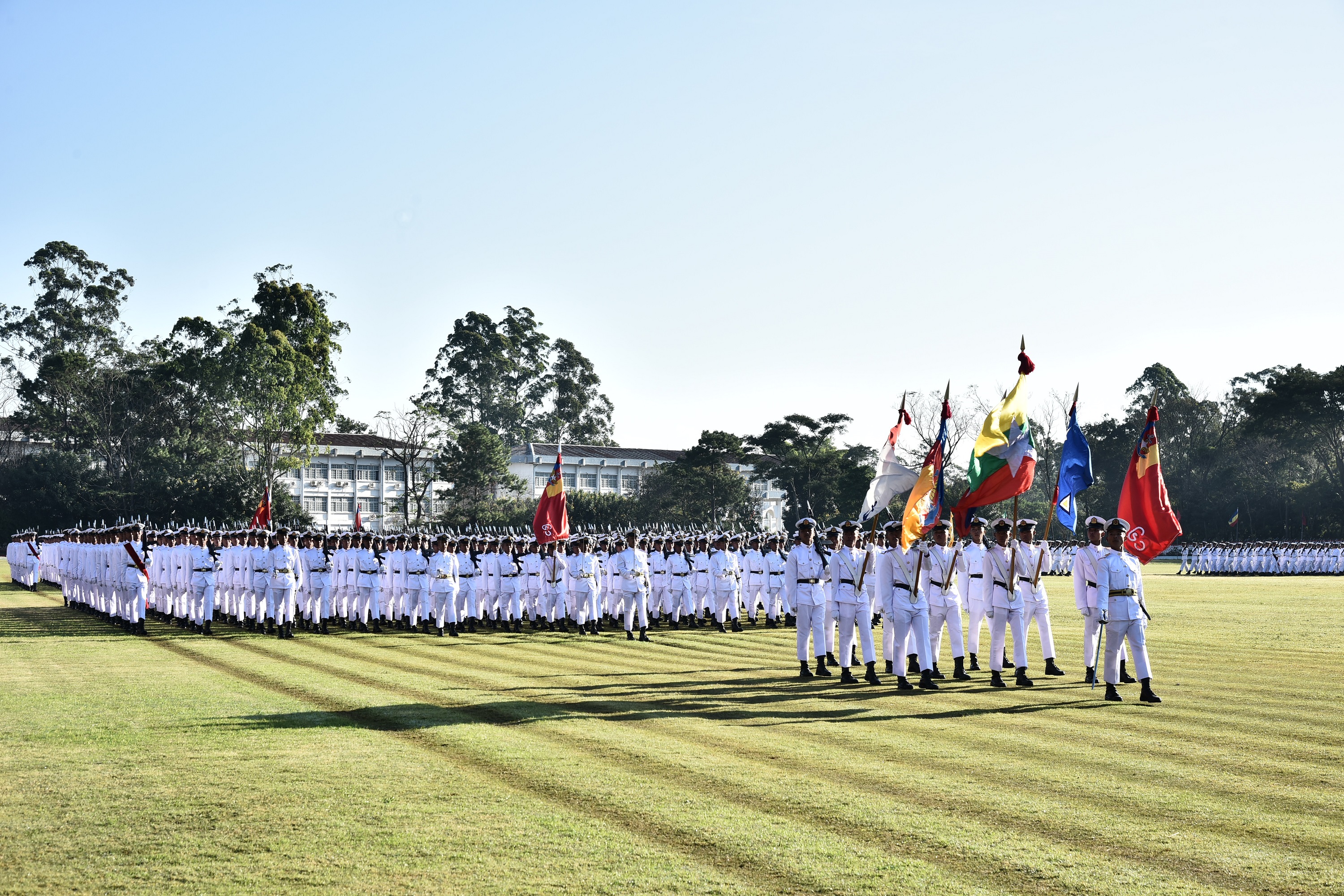 ဦးစြာ တပ္မေတာ္ကာကြယ္ေရးဦးစီးခ်ဳပ္ ဗိုလ္ခ်ဳပ္မႉးႀကီး မဟာသေရစည္သူ မင္းေအာင္လႈိင္က ဗိုလ္ေလာင္းတပ္ရင္းမ်ား၏ အေလးျပဳျခင္းကိုခံယူၿပီး ေက်ာင္းဆင္း ဗိုလ္ေလာင္းတပ္ရင္းမ်ားကို စစ္ေဆးသည္။ ထို႔ေနာက္ တပ္မေတာ္ကာကြယ္ေရးဦးစီးခ်ဳပ္ ဗိုလ္ခ်ဳပ္မႉးႀကီး မဟာသေရစည္သူ မင္းေအာင္လႈိင္အား ဗိုလ္ေလာင္းတပ္ရင္းမ်ားက အေႏွးေလွ်ာက္၊ အျမန္ေလွ်ာက္တို႔ျဖင့္ ခ်ီတက္ အေလးျပဳၾကသည္။