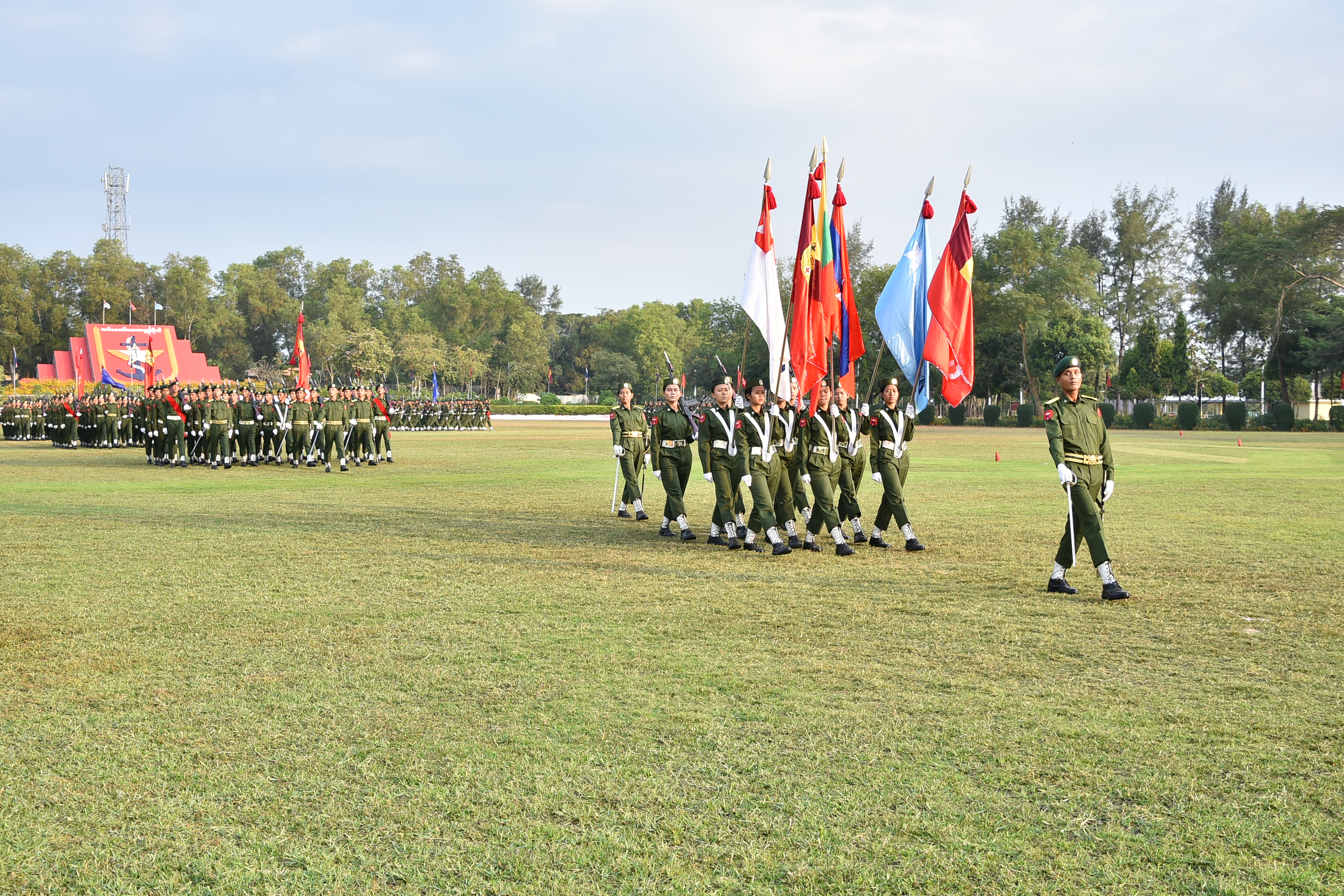 ထို႔ေနာက္တပ္မေတာ္ကာကြယ္ေရးဦးစီးခ်ဳပ္ ဗိုလ္ခ်ဳပ္မႉးႀကီး မဟာသေရစည္သူ မင္းေအာင္လႈိင္သည္ သင္တန္းတပ္ခြဲမ်ား၏ အေလးျပဳျခင္းကိုခံယူၿပီး စစ္ေရးျပအခမ္း အနားမွျပန္လည္ထြက္ခြာသည္။