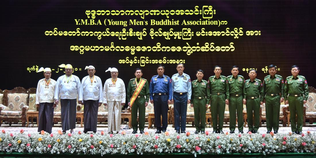 ဗုဒ္ဓဘာသာကလျာဏယုဝအသင်းကြီး (YMBA) ၏ ရာသက်ပန်ဂုဏ်ထူးဆောင် နာယက တပ်မတော် ကာကွယ်ရေးဦးစီးချုပ် ဗိုလ်ချုပ်မှူးကြီး မင်းအောင်လှိုင်အား (YMBA) ၏ အမြင့်ဆုံးဘွဲ့တော်ဖြစ်သည့် “အဂ္ဂမဟာမင်္ဂလဓမ္မဇောတိကဓဇဘွဲ့တော်”ဂုဏ်ပြုချီးမြှင့်