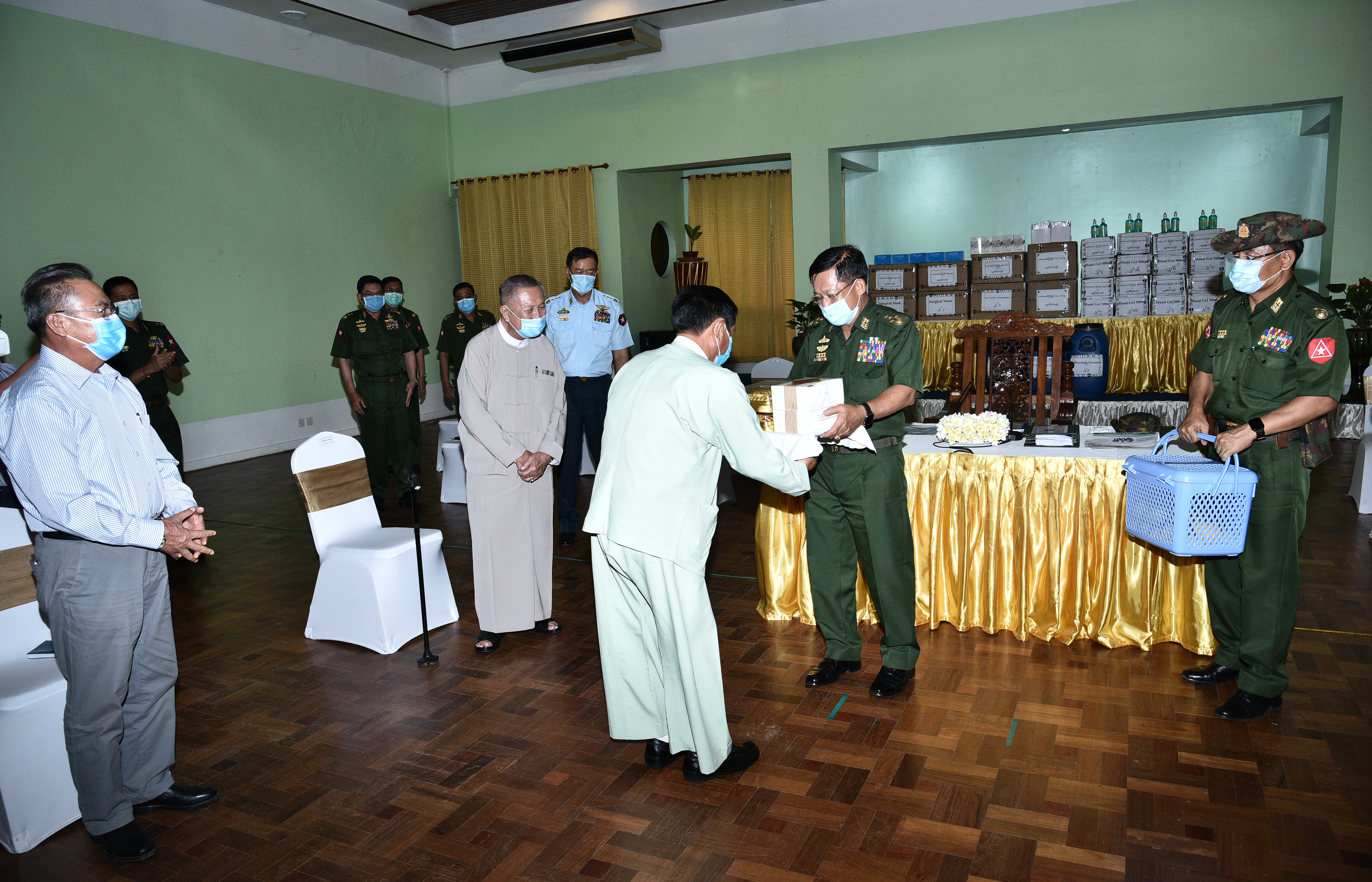 ယင်းနောက် တပ်မတော်ကာကွယ်ရေးဦးစီးချုပ်က ရပ်မိရပ်ဖများနှင့် ဌာနဆိုင်ရာ တာဝန်ရှိသူများအား COVID-19 ရောဂါကာကွယ်ထိန်းချုပ်ကုသရေးလုပ်ငန်း အထောက်အကူပြုပစ္စည်းများ ဖြစ်သည့် Surgical Masks ၁၀၀၀၀ ခု၊ Bleaching Powder ၃ ပုံး၊ Non-Contact Thermometer ၅၀ ခု၊ Hand Gel၂၅၀ ဘူးနှင့် N 95 Mask ၅၀၀ ခုနှင့် စားသောက်ဖွယ်ရာများ၊ လက်ဆောင်ပစ္စည်းများအား ထောက်ပံ့ပေးအပ်ရာ မြို့မိမြို့ဖများက လက်ခံရယူခဲ့ကြသည်။