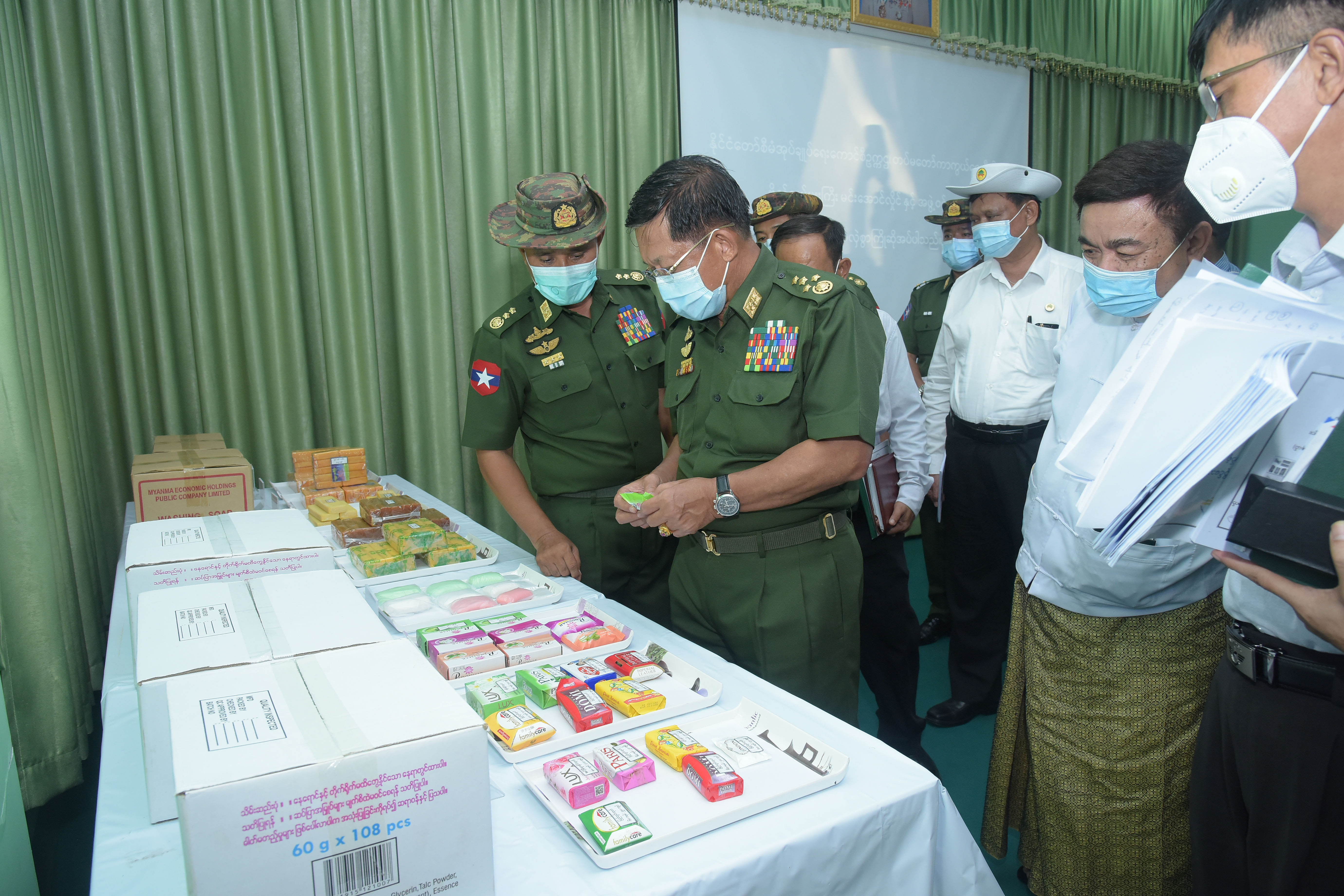 ထို႔ေနာက္ ႏိုင္ငံေတာ္စီမံအုပ္ခ်ဳပ္ေရးေကာင္စီ ဥကၠ႒၊ တပ္မေတာ္ကာကြယ္ေရး ဦးစီးခ်ဳပ္ႏွင့္ အဖြဲ႕ဝင္မ်ားသည္ စက္႐ုံမွ ထုတ္လုပ္သည့္ ဆပ္ျပာမ်ားႏွင့္ ေဈးကြက္ အတြင္း အသုံးျပဳလ်က္ရွိသည့္ ဆပ္ျပာခဲမ်ားအား ၾကည့္ရႈၾကၿပီး စက္႐ုံအတြင္း ဆပ္ျပာ ထုတ္လုပ္ေနမႈအေျခအေနမ်ားအား လွည့္လည္ၾကည့္ရႈစစ္ေဆးၿပီး လိုအပ္သည္မ်ားမွာ ၾကားခဲ့ကာ စက္႐ုံဝန္ထမ္းမ်ားအတြက္ ခ်ီးျမႇင့္ေငြမ်ားကို ေပးအပ္သည္။
