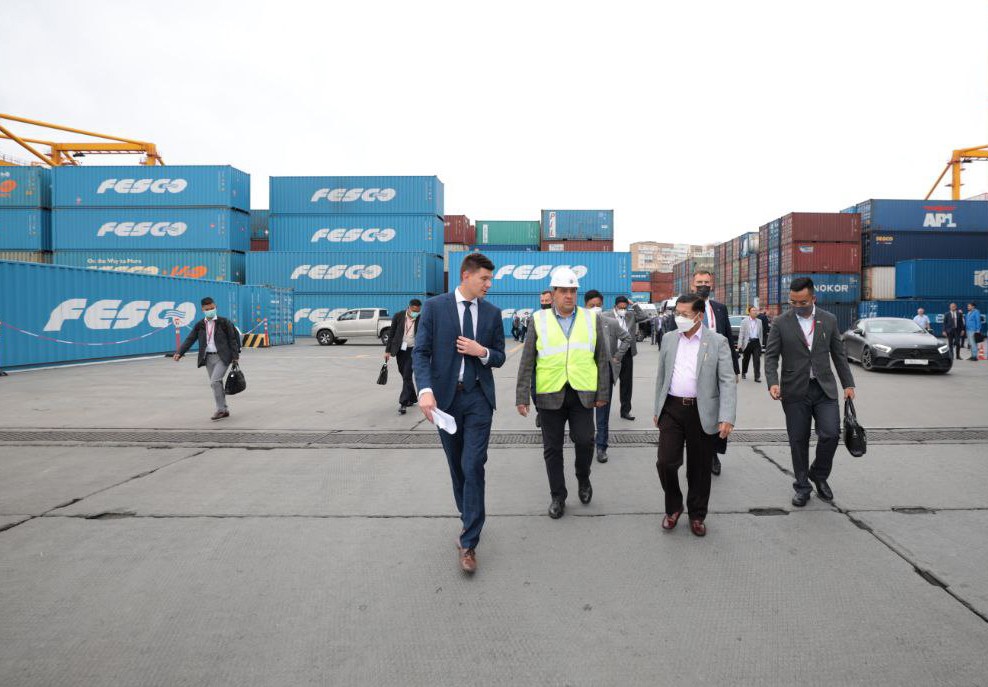 ယင်းနောက် နိုင်ငံတော်စီမံအုပ်ချုပ်ရေးကောင်စီဥက္ကဋ္ဌ နိုင်ငံတော် ဝန်ကြီးချုပ် ဦးဆောင်သည့် အဆင့်မြင့်ကိုယ်စားလှယ်အဖွဲ့သည် ဆိပ်ကမ်းအတွင်းလှည့်လည် ကြည့်ရှု လေ့လာကြရာ ဗလာဒီဗော့ စတော့ခ် အပြည်ပြည်ဆိုင်ရာဆိပ်ကမ်း Managing Director ဖြစ်သူ Mr. Vladimir Korchanov နှင့် တာဝန်ရှိသူများက Container Terminal နှင့် Universal Terminal တို့၏ လုပ်ငန်းဆောင်ရွက်နေမှုများ၊ ကိုယ်ပိုင် သင်္ဘောကြီးများ၊ ကွန်တိန်နာများ၊ ရထားလမ်းများ၊ ကုန်းလမ်းပို့ဆောင်ရေးယာဉ်များ ဖြင့် (FESC)၏ လုပ်ငန်းဆောင်ရွက်မှုကို လည်ပတ်လျက်ရှိသည့် အခြေအနေများနှင့် ပတ်သက်၍ ရှင်းလင်းပြောကြားခဲ့ပြီး နိုင်ငံတော်စီမံအုပ်ချုပ်ရေးကောင်စီဥက္ကဋ္ဌ နိုင်ငံတော် ဝန်ကြီးချုပ် က သိရှိလိုသည်များ ပြန်လည်မေးမြန်းဆွေးနွေးကာ အမှတ်တရ စုပေါင်းဓာတ်ပုံ ရိုက်ကြသည်။