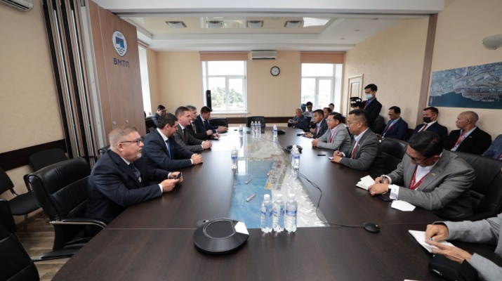 ဆက်လက်ပြီး ညနေပိုင်းတွင် နိုင်ငံတော်စီမံအုပ်ချုပ်ရေးကောင်စီဥက္ကဋ္ဌ နိုင်ငံတော် ဝန်ကြီးချုပ် ဦးဆောင်သည့် အဆင့်မြင့်ကိုယ်စားလှယ်အဖွဲ့သည် ဗလာဒီဗော့ စတော့ခ် အပြည်ပြည်ဆိုင်ရာဆိပ်ကမ်း Commercial Port OF Vladivostok သို့ ရောက်ရှိ လေ့လာကြရာ Far Easterm Shipyard Company(FESC) ၏ အကြီးအကဲ Mr. Andrey Severilov နှင့် Board of Directors အဖွဲ့ဝင်များက ကြိုဆိုနှုတ်ဆက်ကြသည်။ ထို့နောက် အစည်းအဝေးခန်းမတွင် (FESC)၏ အကြီးအကဲက (FESC)၏ လုပ်ငန်း ဆောင်ရွက်နေမှုအခြေအနေများ၊ အရှေ့တောင်အာရှ နိုင်ငံများနှင့် ကုန်စည်စီးဆင်းမှု ဆိုင်ရာ ဆောင်ရွက်နေမှု အခြေအနေများ၊ မြန်မာနိုင်ငံနှင့် ဆိပ်ကမ်းလုပ်ငန်းပိုင်းဆိုင်ရာနှင့် ကုန်စည်ပို့ဆောင်ရေးဆိုင်ရာ ဆောင်ရွက်နိုင်မည့် အခြေအနေများနှင့် ပတ်သက်၍ ရှင်းလင်း တင်ပြသည်။