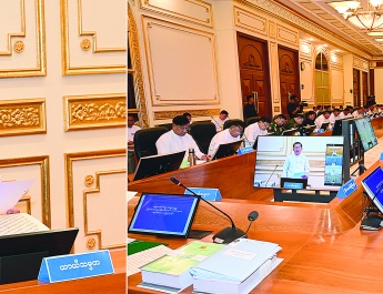ႏိုင္ငံေတာ္စီမံအုပ္ခ်ဳပ္ေရးေကာင္စီဥကၠ႒ ႏိုင္ငံေတာ္ဝန္ႀကီးခ်ဳပ္ ဗိုလ္ခ်ဳပ္မႉးႀကီး မင္းေအာင္လႈိင္ သည္ ျပည္ေထာင္စုအဆင့္ပုဂၢိဳလ္မ်ားႏွင့္ ျပည္ေထာင္စုဝန္ႀကီးဌာနမ်ားမွ တာဝန္ရွိသူမ်ားအား ယေန႔နံနက္ပိုင္းတြင္ ေနျပည္ေတာ္ရွိ ႏိုင္ငံေတာ္စီမံအုပ္ခ်ဳပ္ေရး ေကာင္စီဥကၠ႒႐ုံး ငုေ႐ႊဝါ ခန္းမ၌ေတြ႕ဆုံ အမွာစကားေျပာၾကားသည္။