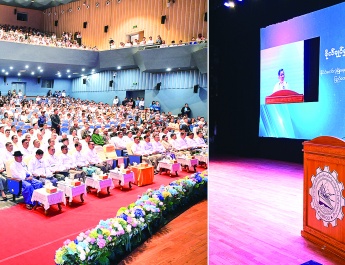 ထို့နောက် နိုင်ငံတော်စီမံအုပ်ချုပ်ရေးကောင်စီဥက္ကဋ္ဌ နိုင်ငံတော်ဝန်ကြီးချုပ် ဗိုလ်ချုပ်မှူးကြီး မင်းအောင်လှိုင် က နိုင်ငံစီးပွားရေးဖွံ့ဖြိုးတိုးတက်မှုနှင့် ကာကွယ်ရေး စွမ်းပကားမြှင့်တင်ရေးနှင့် ပတ်သက်၍ ပြောကြားရာတွင် “ကျွန်တော်တို့အတွက် ဒီနှစ် ၂၀၂၂ ခုနှစ်ဟာ ကျွန်တော်တို့အတွက်လည်း စိန်ခေါ်တဲ့နှစ်တစ်နှစ်လည်း ဖြစ်လာ နေပြီ။ ဘာလို့ဆိုတော့ ဒီစီးပွားရေးကိုပြန်ပြီးတော့ မတ်လာအောင်လုပ်မယ်ဆိုရင် တော့ ကျွန်တော်တို့အပေါ်မှာပြည်သူက ယုံကြည်မှုရှိလာမယ်။ ကျွန်တော့်ရဲ့ ရည်မှန်းချက် ၃ ခုရှိပါတယ်။ တစ်အချက်ကတော့ တိုင်းပြည်စီးပွားရေးကို ကျွန်တော် ရအောင်ဆွဲ တင်မယ်ပြောထားတယ်။ ပြီးခဲ့တဲ့နှစ်အတွေ့အကြုံအရ ကျွန်တော်တို့ မလုပ်နိုင်စရာ အကြောင်းမရှိဘူး။ ၂၀၂၂ ခုနှစ်မှာ စီးပွားရေးအားကောင်းအောင် ကျွန်တော်တို့ တိုးတက်အောင်လုပ်မယ်။ ပြီးရင် ဒုတိယကတော့ ကျွန်တော်တို့ရဲ့ နိုင်ငံရေး၊ ရှေ့လုပ်ငန်းစဉ်မှာဖော်ပြထားတဲ့ ပါတီစုံဒီမိုကရေစီစနစ်ဖော်ဆောင်ရေးနဲ့ ပတ်သက်တဲ့ လုပ်ငန်းရပ်တွေမှာ ကျွန်တော်တို့ရတဲ့ လမ်းကြောင်းတွေမှာ ကျွန်တော်တို့ အကုန်လုပ် မှာ။ အဲ့ဒီနှစ်ခု နိုင်ငံရေးကလည်း ကောင်းနေတယ်။ စီးပွားရေးကလည်း အားကောင်း လာပြီဆိုရင် ဒီဘက်ကနိုင်ငံတော်ကာကွယ်ရေးအတွက်ကို အားလုံးပါဝင်တဲ့ ကာကွယ်ရေးစနစ်ကို နောင်ကျွန်တော်တို့သွားရမယ်။ အားလုံးပါဝင်တဲ့။ ကျွန်တော်တို့ ဉပမာ ကျွန်တော်တို့ဆီမှာ အမျိုးသားစစ်မှုထမ်းဉပဒေ မကျင့်သုံး ရသေးဘူး။ နိုင်ငံသားတိုင်းဟာ စစ်မှုထမ်းဖို့တာဝန်ရှိတယ်။ အမျိုးသားစစ်မှုထမ်း ဉပဒေ ကျွန်တော်တို့မကျင့်သုံးရတာ ဘာဖြစ်လို့လဲဆိုတော့ ပြည်တွင်းလက်နက်ကိုင် ပဋိပက္ခတွေရှိလို့ ကျွန်တော်တို့လုပ်လို့မရဘူး။ ခုနကပြောတဲ့ တစ်ရယ်၊ နှစ်ရယ် ကျွန်တော်တို့က ကောင်းကောင်းထိန်းနိုင်ပြီ၊ လုပ်နိုင်ပြီဆိုလို့၊ လက်ထဲမှာပိုင်ပိုင် နိုင်နိုင်ရှိပြီဆိုလို့ရှိရင် တတိယဖြစ်တဲ့ ကာကွယ်ရေးစွမ်းပကားတွေကို ရအောင် ကျွန်တော်တို့က မြှင့်တင်ရမယ်။ အဲ့ဒီမှာ အမျိုးသားစစ်မှုထမ်းဉပဒေအရ နိုင်ငံသား တွေစစ်မှုထမ်းရမယ်။ ၂ နှစ်တန်သည်၊ ၃ နှစ်တန်သည်၊ ဒါသူ့ရဲ့ သတ်မှတ်ထားတဲ့ ဟာအတိုင်း ကျွန်တော်တို့ စစ်မှုထမ်းရမယ်။ တစ်နှစ်လည်းဖြစ်ရင်ဖြစ်မှာပေါ့ဗျာ၊ တစ်နှစ်ခွဲလည်းဖြစ်ရင်ဖြစ်မှာပေါ့။ အခြေအနေပေါ်မူတည်ပြီးတော့ တိုင်းပြည်ရဲ့အခြေ အနေပေါ်မူတည်ပြီး တော့လုပ်ရမှာပေါ့။ ဒါကလုပ်ရမှာ၊ မလုပ်လို့မရဘူး။ ကာကွယ်ရေး စွမ်းအားမကောင်းတော့ ကျွန်တော်တို့ခံသွားရမှာပေါ့။ သူများက ဖင်ပုတ်၊ ခေါင်းပုတ် လာလုပ်သွားမှာပေါ့။ စီးပွားရေးအား မကောင်းလည်း ပိုက်ဆံမရှိတော့ မျက်နှာငယ် ရတယ်။ နို