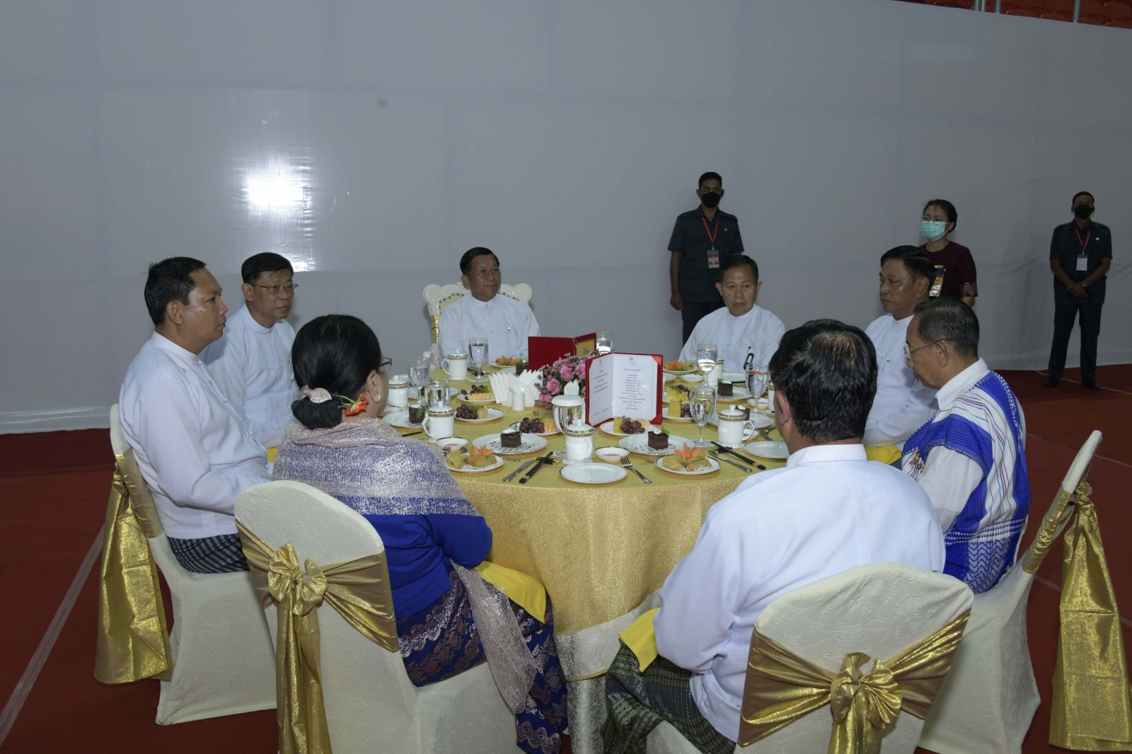ယင်းနောက် နိုင်ငံတော်စီမံအုပ်ချုပ်ရေးကောင်စီဥက္ကဋ္ဌ၊ နိုင်ငံတော်ဝန်ကြီးချုပ်နှင့် အဖွဲ့ဝင်များသည် နိုင်ငံ့ဂုဏ်ဆောင်အားကစားသမားများနှင့် နည်းပြများကို ရင်းရင်းနှီးနှီး နှုတ်ဆက်၍ ဂုဏ်ပြု လက်ဖက်ရည်ဝိုင်းဖြင့် တည်ခင်းဧည့်ခံခဲ့ကြောင်းသတင်းရရှိသည်။