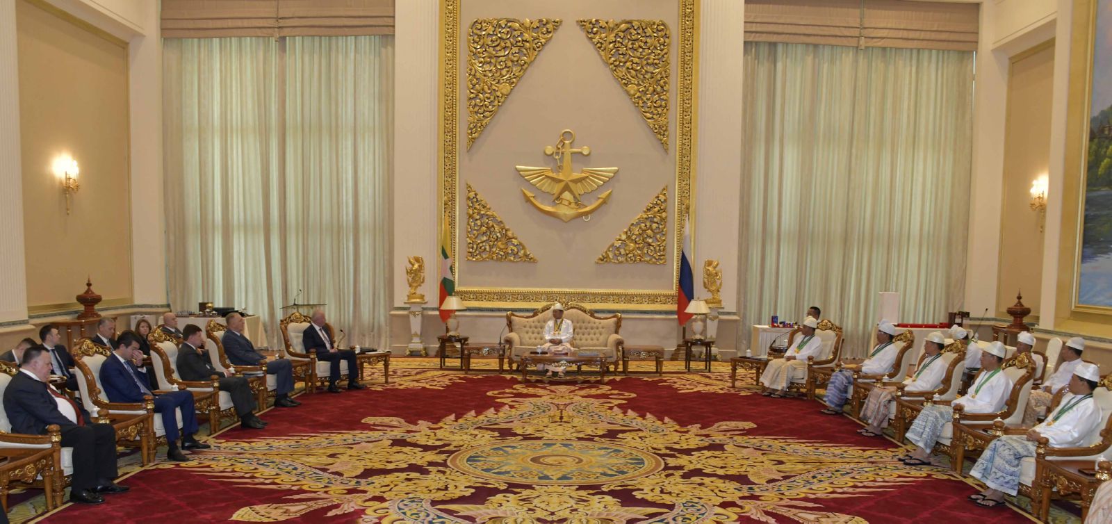 ထို့နောက် နိုင်ငံတော်စီမံအုပ်ချုပ်ရေးကောင်စီဥက္ကဋ္ဌ နိုင်ငံတော်ဝန်ကြီးချုပ်က စွမ်းဆောင်မှုဆိုင်ရာ ဘွဲ့တံဆိပ်ရရှိခဲ့သည့် ရုရှားဖက်ဒရေးရှင်းနိုင်ငံ၊ ကာကွယ်ရေး ဝန်ကြီးဌာန၊ ဒုတိယဝန်ကြီးအား ဂုဏ်ပြုစကားနှင့် ရုရှားသိပ္ပံအကယ်ဒမီ၊ အရှေ့တိုင်း လေ့လာရေး အင်စတီကျူ့မှ ပေးအပ်သည့် “ဂုဏ်ထူးဆောင် ဒေါက်တာဘွဲ့”ကို လက်ခံ ရရှိခဲ့သည့်အတွက် ကျေးဇူးတင်စကား ပြန်လည်ပြောကြားရာတွင် မိမိအနေဖြင့် ရုရှား ဖက်ဒရေးရှင်းနိုင်ငံ၊ ကာကွယ်ရေးဝန်ကြီးဌာန၊ ဒုတိယဝန်ကြီးအား စွမ်းဆောင်မှု ဆိုင်ရာ ဂုဏ်ထူးဆောင်ဘွဲ့ဖြစ်သည့် သီရိပျံချီ ဘွဲ့တံဆိပ်နှင့် အဆောင်အယောင်ကို ချီးမြှင့်ပေးအပ်နိုင်သည့်အတွက် များစွာ ဝမ်းမြောက်မိပါကြောင်း၊ သီရိပျံချီဘွဲ့သည် ပြည်ထောင်စုမြန်မာနိုင်ငံတော်၏ ကောင်းရာကောင်းကျိုး ဖြစ်ထွန်းစေရေး ထူးကဲ ကောင်းမွန်စွာ ဆောင်ရွက်သူများကို ပေးအပ်ချီးမြှင့်သည့် ဘွဲ့တံဆိပ်တစ်ခုဖြစ်ပါ ကြောင်း၊ အဆွေတော်အနေဖြင့် မိမိတို့ မြန်မာနိုင်ငံတော်နှင့် နိုင်ငံသူ၊ နိုင်ငံသားများ၏ အကျိုးစီးပွား၊ မြန်မာ့တပ်မတော်ကို ခေတ်မီဖွံ့ဖြိုးတိုးတက်စေရေးအတွက် ကူညီ ဆောင်ရွက်ပေးခဲ့သည့်အပြင် ရုရှား-မြန်မာ နှစ်နိုင်ငံအကြား ချစ်ကြည်ရင်းနှီးမှုနှင့် ပူး ပေါင်းဆောင်ရွက်မှုများကို ပိုမိုအားကောင်းလာစေရန် ဆောင်ရွက်ပေးခဲ့သည့်အတွက် ယခုကဲ့သို့ စွမ်းဆောင်မှုဆိုင်ရာ ဘွဲ့တံဆိပ်ကို ချီးမြှင့်ပေးအပ်ရခြင်းဖြစ်ပါကြောင်း၊ အဆွေတော်၏ ကြိုးစားအားထုတ်မှုများကြောင့် မိမိတို့နှစ်နိုင်ငံနှင့် နှစ်နိုင်ငံ တပ်မတော် နှစ်ရပ်အကြား ကဏ္ဍပေါင်းစုံတွင် ပူးပေါင်းဆောင်ရွက်မှုအမြင့်ဆုံး အခြေအနေသို့ ရောက်ရှိခဲ့ရခြင်း ဖြစ်ပါကြောင်း။
