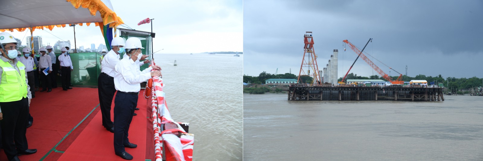 ယင်းနောက် နိုင်ငံတော်စီမံအုပ်ချုပ်ရေးကောင်စီဥက္ကဋ္ဌ နိုင်ငံတော်ဝန်ကြီးချုပ်နှင့် အဖွဲ့ဝင်များသည် တံတားတည်ဆောက်ရေးစီမံကိန်းရှိ ရန်ကုန်ဘက်ခြမ်း Main Bridge Pylon 2 နေရာတွင် လုပ်ငန်းဆောင်ရွက်နေမှု အခြေအနေများကို လိုက်လံ ကြည့်ရှု စစ်ဆေးရာ တာဝန်ရှိသူများက ရှင်းလင်းတင်ပြခဲ့သည်။