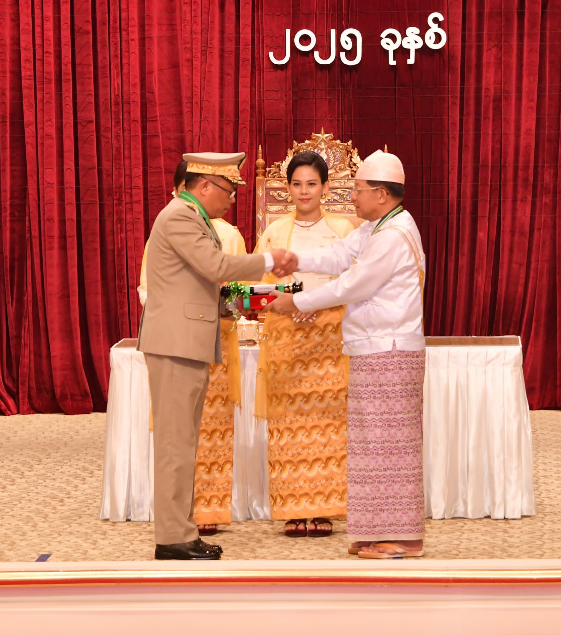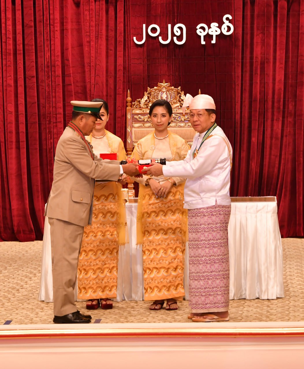 (၇၇) နှစ်မြောက် လွတ်လပ်ရေးနေ့အထိမ်းအမှတ် ဂုဏ်ထူးဆောင်ဘွဲ့များ ချီးမြှင့် အပ်နှင်းခြင်းအခမ်းအနားကို ယနေ့နံနက်ပိုင်းတွင် နိုင်ငံတော်စီမံအုပ်ချုပ်ရေးကောင်စီ ဥက္ကဋ္ဌရုံးသဘင်ဆောင်၌ကျင်းပရာ နိုင်ငံတော်စီမံအုပ်ချုပ်ရေးကောင်စီဥက္ကဋ္ဌ နိုင်ငံတော် ဝန်ကြီးချုပ် ဗိုလ်ချုပ်မှူးကြီး သတိုးမဟာသရေစည်သူ သတိုးသီရိသုဓမ္မ မင်းအောင်လှိုင် တက်ရောက်အမှာစကားပြောကြားပြီး ဂုဏ်ထူးဆောင်ဘွဲ့များ ချီးမြှင့်အပ်နှင်းသည်။