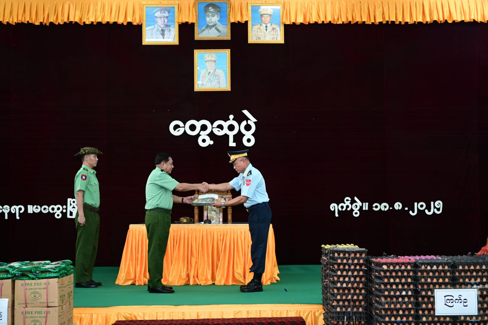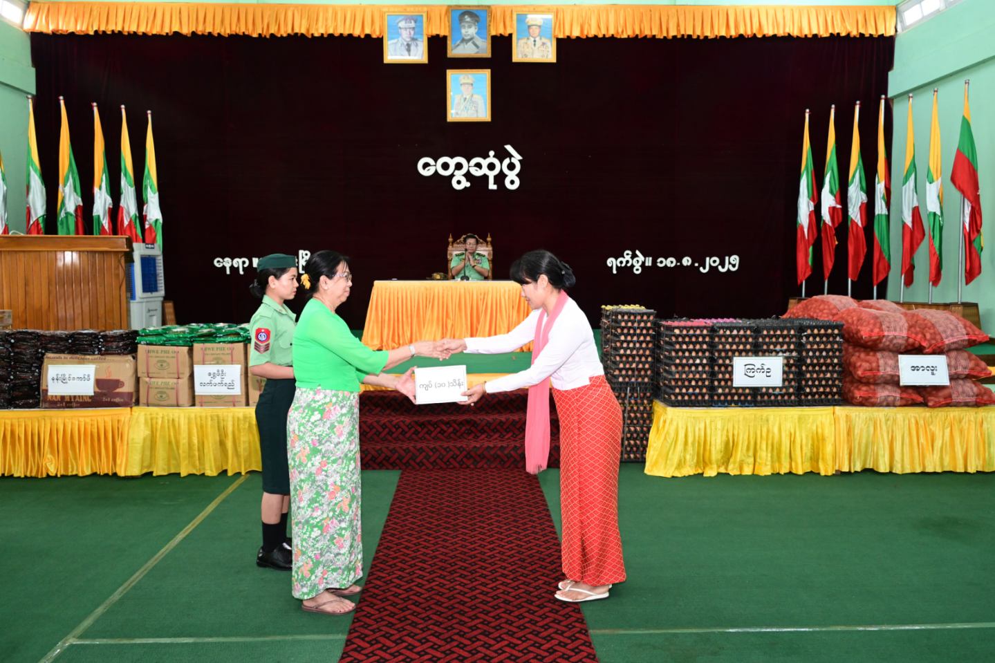 ထို့နောက် နိုင်ငံတော်လုံခြုံရေးနှင့် အေးချမ်းသာယာရေးကော်မရှင်ဥက္ကဋ္ဌ တပ်မတော်ကာကွယ်ရေးဦးစီးချုပ်က တပ်နယ်မှ အရာရှိ၊ စစ်သည်၊ မိသားစုများ အတွက်စားသောက်ဖွယ်ရာပစ္စည်းများကို ပေးအပ်ရာ တပ်နယ်မှူးကလည်းကောင်း၊ နိုင်ငံ တော်လုံခြုံရေးနှင့်အေးချမ်းသာယာရေးကော်မရှင်ဥက္ကဋ္ဌ တပ်မတော်ကာကွယ်ရေး ဦးစီးချုပ်၏ဇနီးကတပ်နယ်မိခင်နှင့် ကလေးစောင့်ရှောက်ရေးအသင်းအတွက် ချီးမြှင့်ငွေများကိုပေးအပ်ရာ တပ်နယ်မှူး၏ ဇနီးကလည်းကောင်းအသီးသီးလက်ခံရယူကြသည်။