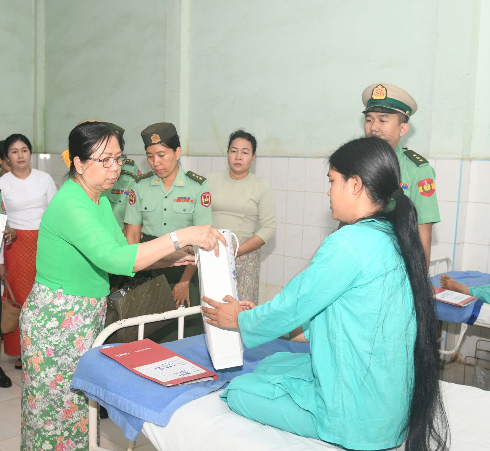 အလားတူနိုင်ငံတော်လုံခြုံရေးနှင့် အေးချမ်းသာယာရေးကော်မရှင်ဥက္ကဋ္ဌ တပ်မတော်ကာကွယ်ရေးဦးစီးချုပ်၏ဇနီးသည်လည်း ဆေးရုံတက်ရောက်ကုသလျက်ရှိသည့်အရာရှိ၊စစ်သည်များ၏မိသားစုဝင်များအားသွားရောက်ကြည့်ရှု၍တစ်ဦးချင်း၏ကျန်းမာရေးအခြေအနေများကို ရင်းရင်းနှီးနှီးမေးမြန်းအားပေးစကား ပြောကြားကာစားသောက်ဖွယ်ရာပစ္စည်းများပေးအပ်ခဲ့သည်။