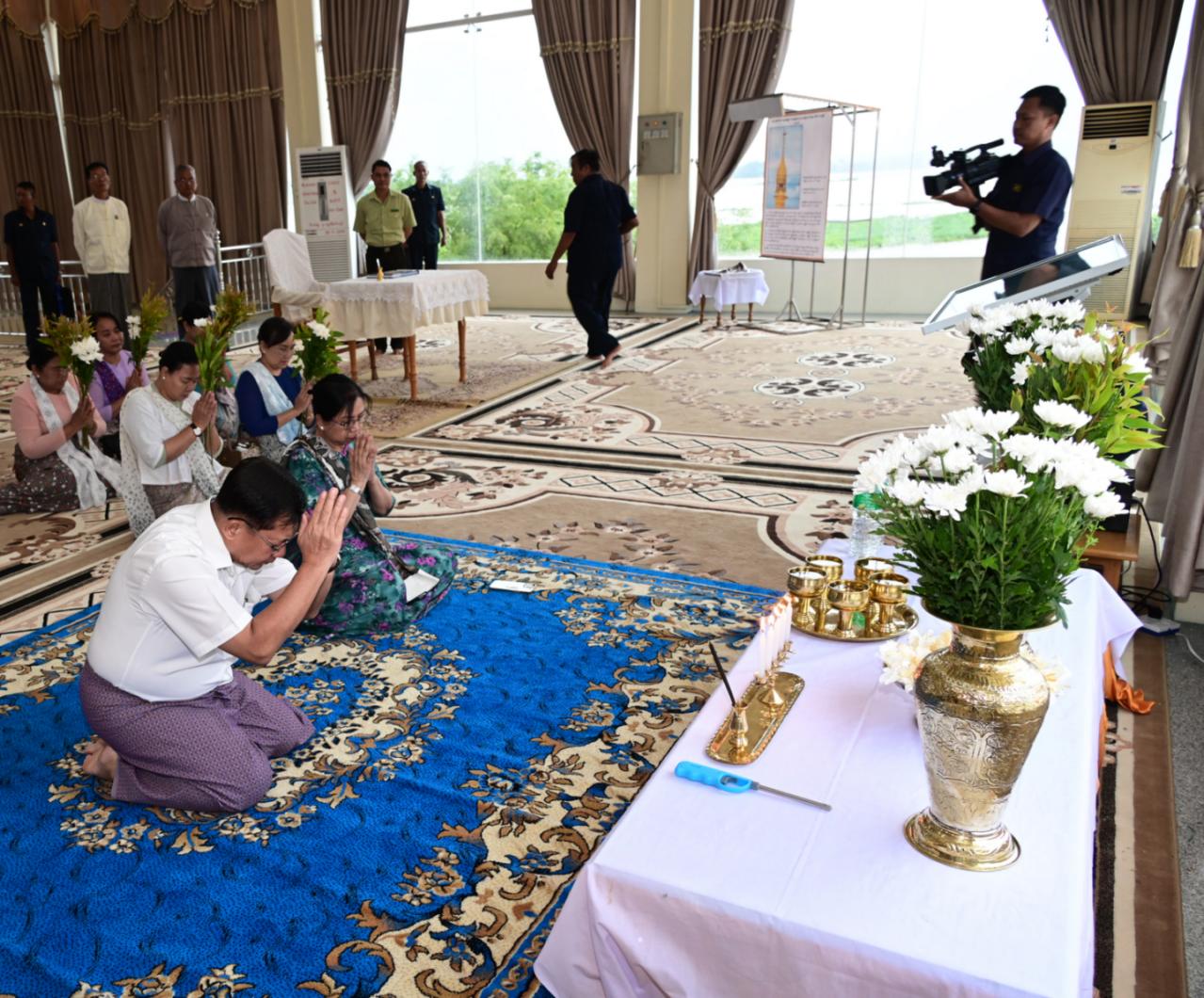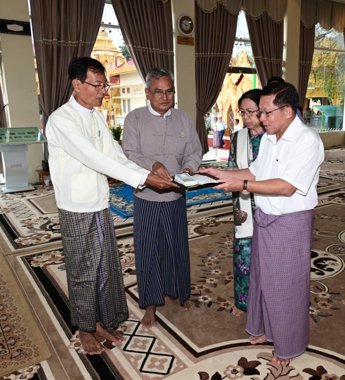 ယင်းနောက် နိုင်ငံတော်လုံခြုံရေးနှင့်အေးချမ်းသာယာရေးကော်မရှင်ဥက္ကဋ္ဌနှင့် ဇနီးတို့သည် စေတီတော်မြတ်ကြီးအတွက်ဘက်စုံအလှူငွေများ ပေးအပ်လှူဒါန်းရာဂေါပကအဖွဲ့ကလက်ခံရယူခဲ့ကြပြီးဓမ္မလက်ဆောင် ပြန်လည်ပေးအပ်သည်။
