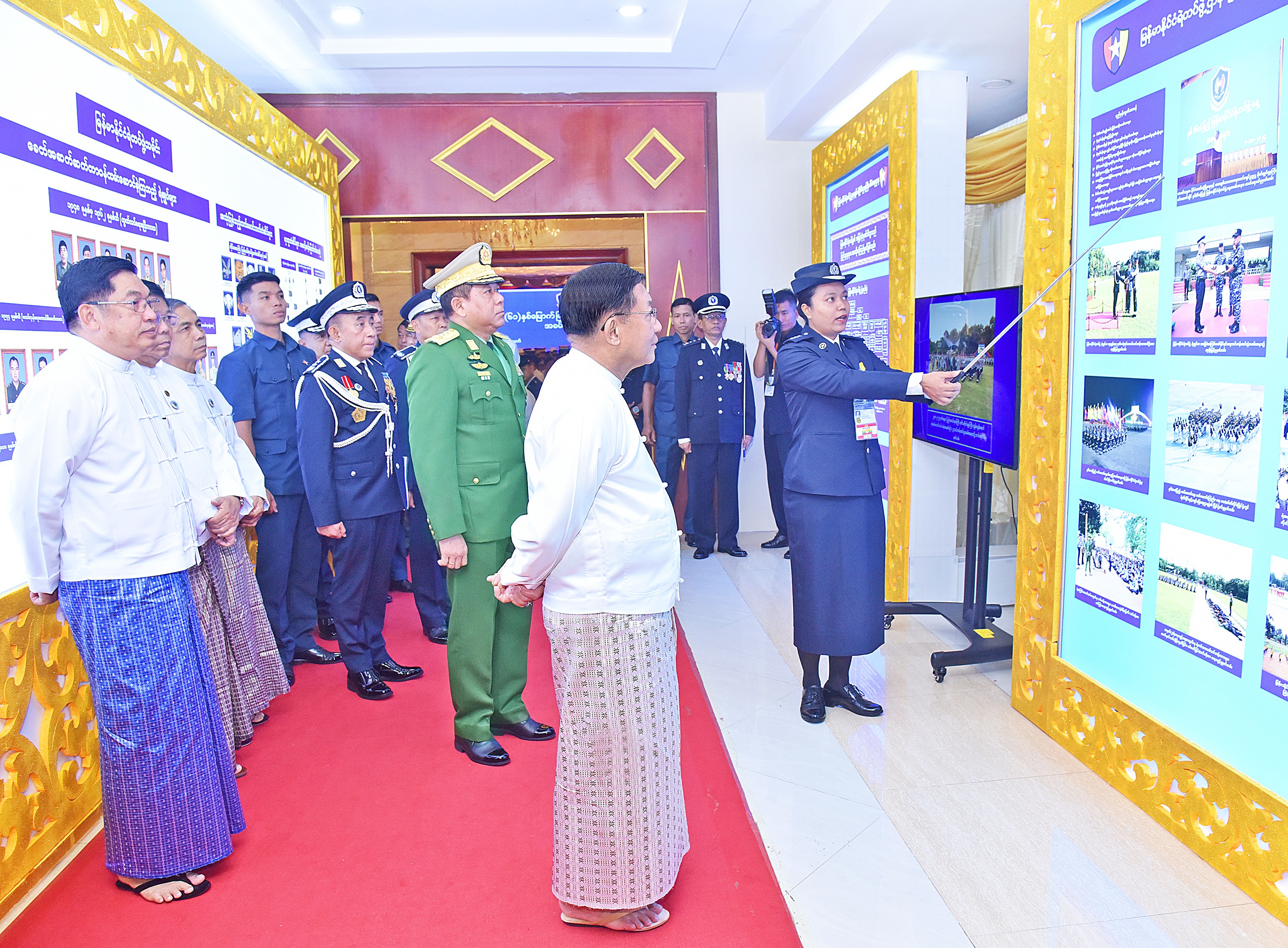 ယင်းနောက် (၆၁)နှစ်မြောက် မြန်မာနိုင်ငံရဲတပ်ဖွဲ့နေ့အထိမ်းအမှတ် ခင်းကျင်း ပြသထားသည့် မှတ်တမ်းဓာတ်ပုံများ၊ တပ်ဖွဲ့/ဌာနများတွင်အသုံးပြုလျက်ရှိသည့် စက်ကိရိယာများ၊ နည်းပညာဆိုင်ရာ ပစ္စည်းများ၊ လက်နက်များ၊ ဝတ်စုံများ၊ ဆက်သွယ်ရေးပစ္စည်းများ၊ ဖမ်းဆီးရမိသည့် မူးယစ်ဆေးဝါးများ နှင့် ပြခန်းများအတွင်း စိတ်ပါဝင်စားစွာဖြင့် လှည့်လည်ကြည့်ရှုခဲ့သည်။