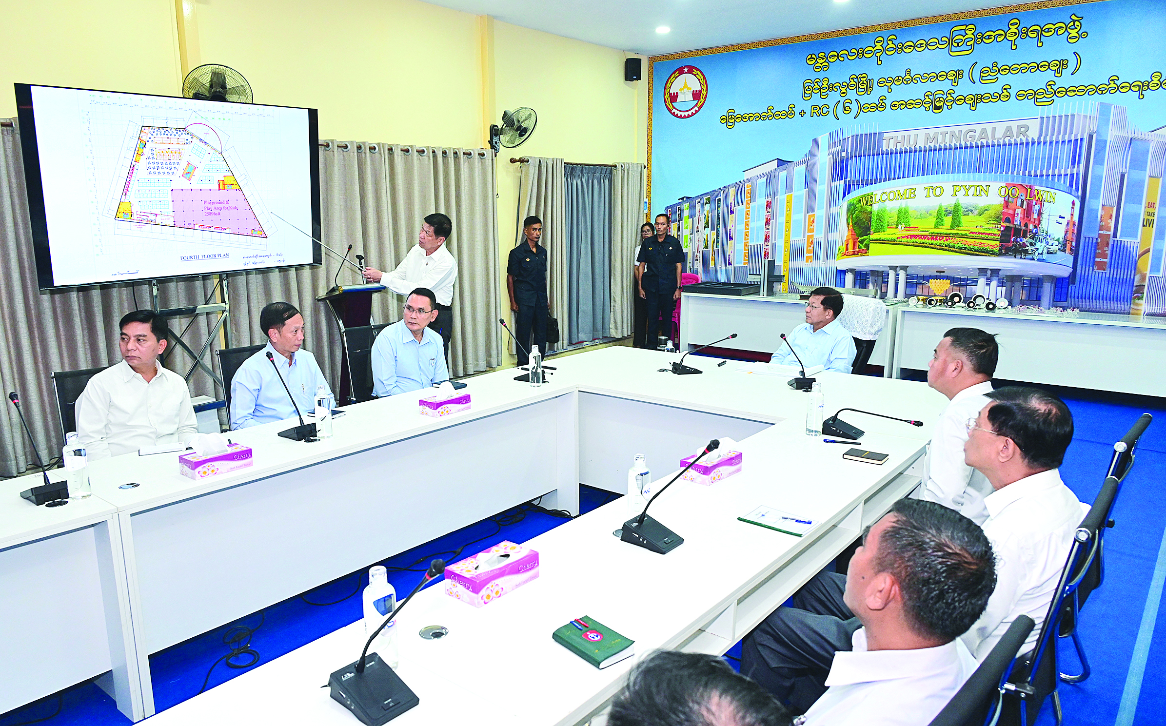 ထို့နောက် နိုင်ငံတော်ယာယီသမ္မတနိုင်ငံတော်လုံခြုံရေးနှင့် အေးချမ်းသာယာရေး ကော်မရှင်ဥက္ကဋ္ဌနှင့် အဖွဲ့ဝင်များသည် ပြင်ဦးလွင်မြို့၊ သုမင်္ဂလာဈေး(ညံတောဈေး) ၆ ထပ် အဆင့်မြင့်ဈေးသစ်တည်ဆောက်ရေစီမံကိန်းသို့ သွားရောက်ကြည့်ရှုစစ်ဆေးရာ မန္တလေးတိုင်းဒေသကြီးဝန်ကြီးချုပ် ဦးမျိုးအောင်က လုပ်ငန်းဆောင်ရွက်နေမှု အခြေ အနေများ၊ နိုင်ငံတော်အကြီးအကဲ စစ်ဆေးစဉ် လမ်းညွှန်မှာကြားချက်များအား အကောင်အထည်ဖော်ဆောင်ရွက်ပြီးစီးမှုအခြေအနေများ၊ အထပ်အလိုက်ဆိုင်ခန်းများဖွင့်လှစ် နိုင် ရေး လျာထားဆောင်ရွက်လျက်ရှိမှု၊ ယာဉ်ရပ်နားသည့်နေရာများဆောင်ရွက်ထားရှိမှု၊ ရေဝင်ရေထွက်ကောင်းမွန်စေရေးနှင့် ရေဆိုးစွန့်ထုတ်မှုတို့အတွက် တွက်ချက်ဆောင်ရွက် ထားရှိမှုနှင့် နေရောင်ခြည်စွမ်းအင်သုံးလျှပ်စစ် ဓာတ်အားထုတ်လုပ်နိုင်ရေး ဆိုလာပြား များတပ်ဆင်ဆောင်ရွက်၍ လျှပ်စစ်ဓာတ်အား လိုအပ်ချက်ကို ပံ့ပိုးဆောင်ရွက်သွားမည့် အခြေအနေများ၊ စီမံကိန်းအား သတ်မှတ်ကာလ အတွင်းပြီးစီးနိုင်ရေးနှင့် ဆောက်လုပ်မှု စံချိန်စံညွှန်းများနှင့် ကိုက်ညီမှုရှိစေရေး ကြပ်မတ် ဆောင်ရွက်လျက်ရှိသည့် အခြေအနေ များနှင့်ပတ်သက်၍ ရှင်းလင်းတင်ပြသည်။