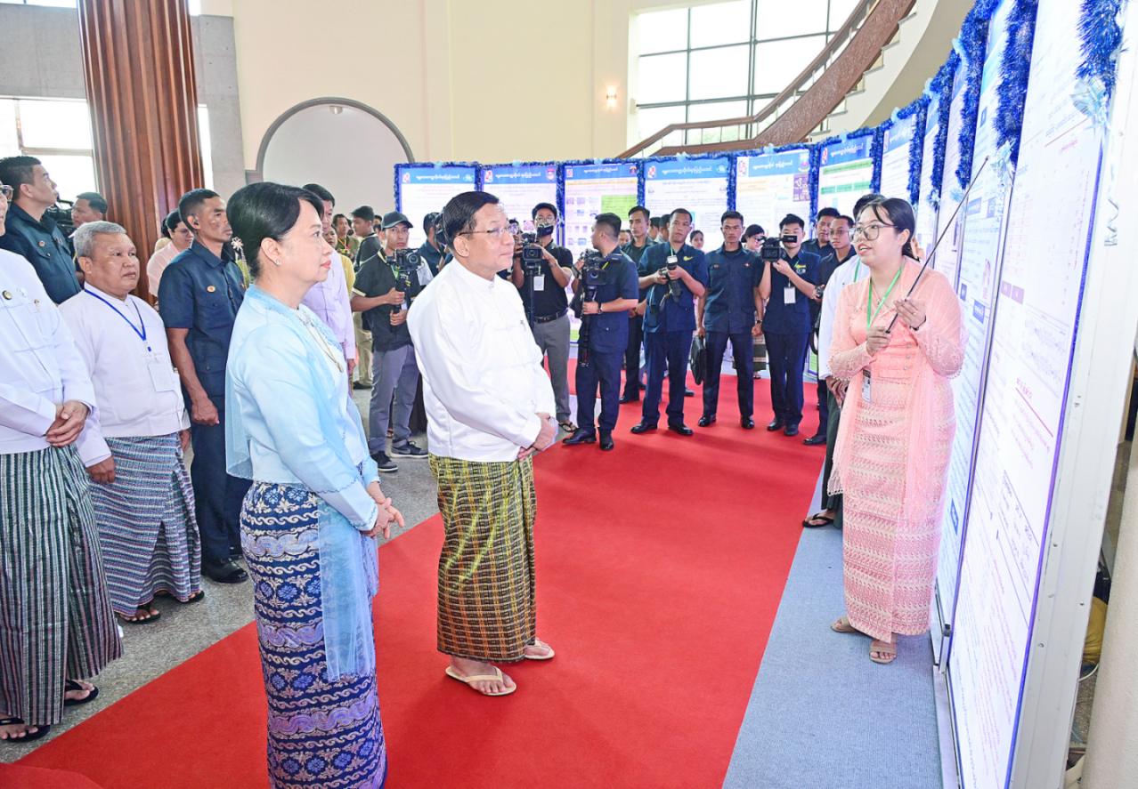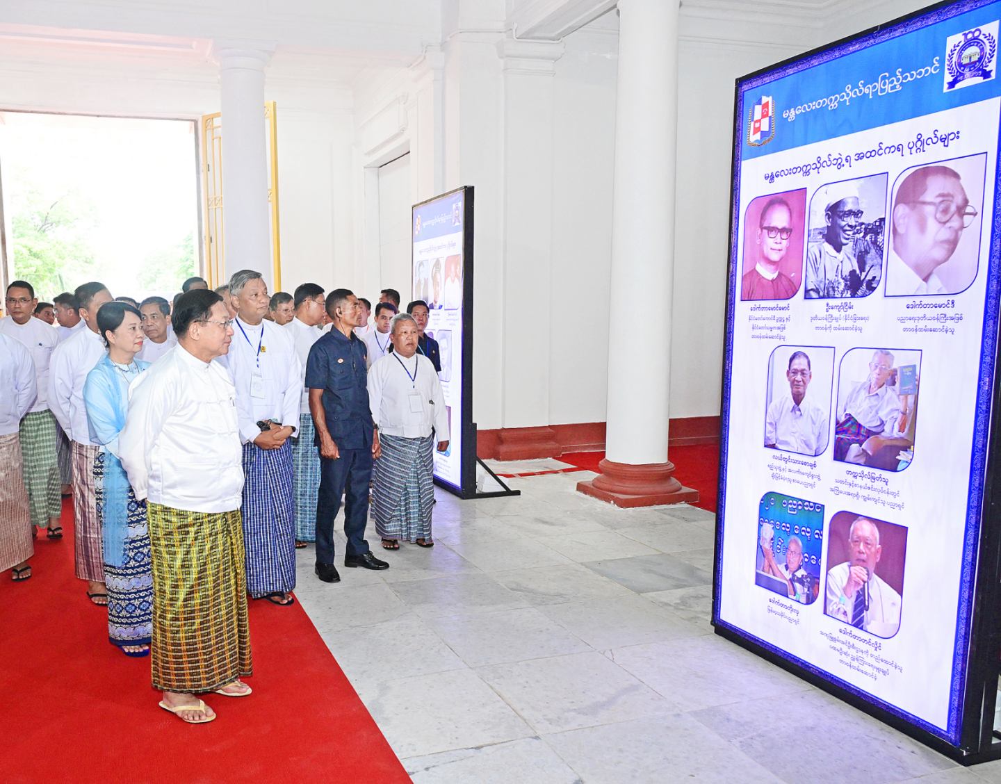 ယင်းနောက် နိုင်ငံတော်ယာယီသမ္မတ နိုင်ငံတော်လုံခြုံရေးနှင့် အေးချမ်းသာယာ ရေး ကော်မရှင်ဥက္ကဋ္ဌနှင့်အဖွဲ့ဝင်များသည် ဘွဲ့နှင်းသဘင်ခန်းမအတွင်းခင်းကျင်းပြသထား သည့် မန္တလေးတက္ကသိုလ် ရာပြည့်သဘင်အခမ်းအနားအထိမ်းအမှတ် ပြခန်းများအား ပြခန်းတစ်ခုချင်းစီအလိုက်နှင့် ပညာရပ်ဆိုင်ရာ သုတေသနစာတမ်းပိုစတာများအား စိတ်ပါဝင်စားစွာဖြင့် လှည့်လည်ကြည့်ရှုကြသည်။