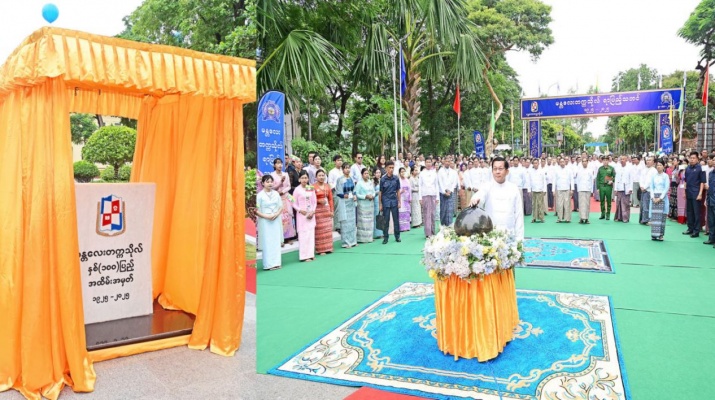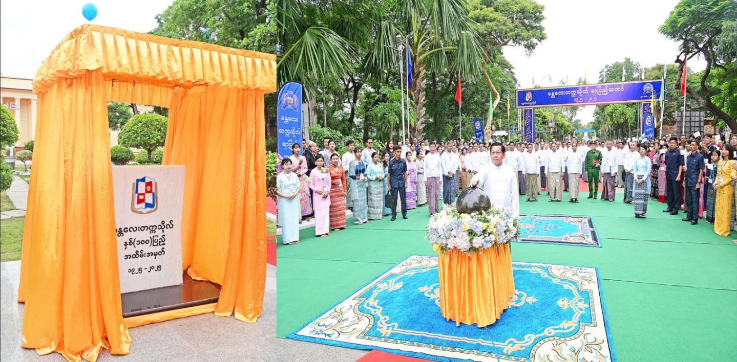 “ရွှေနှစ် ၁၀၀ ထူးချွန်မှု၊ ဆန်းသစ်တီထွင်ဦးဆောင်ပြု၊ စိတ်ဉာဏ်စွမ်းအားတိုးမြှင့်ထား၊ အနာဂတ်ကိုပုံဖော်ထား”