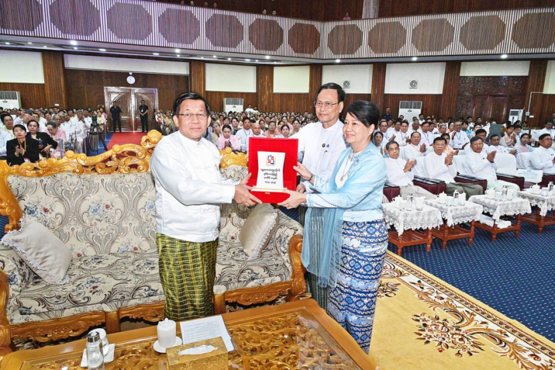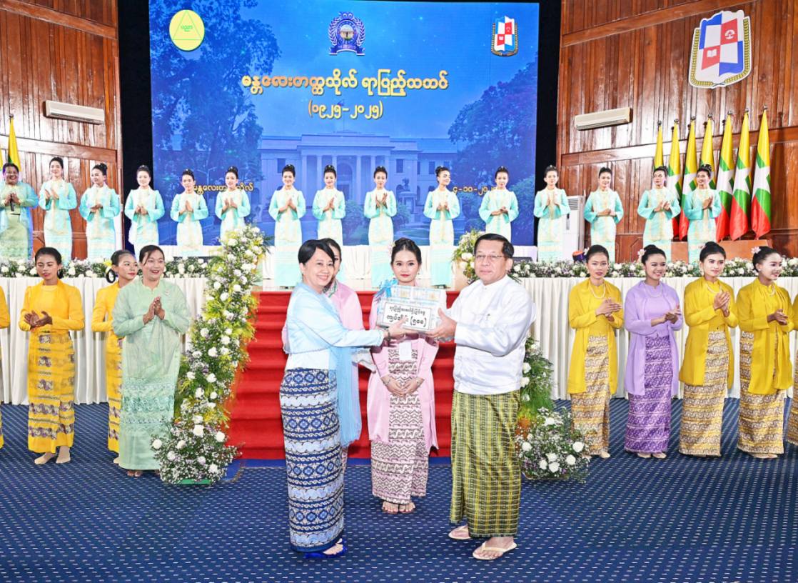 ၎င်းနောက် ဖျော်ဖြေတင်ဆက်ခဲ့သည့် ကျောင်းသား၊ ကျောင်းသူများအား နိုင်ငံတော်ယာယီသမ္မတ နိုင်ငံတော်လုံခြုံရေးနှင့် အေးချမ်းသာယာရေးကော်မရှင်ဥက္ကဋ္ဌ က ဂုဏ်ပြုပန်းခြင်း ပေးအပ်ပြီး အခမ်းအနားတက်ရောက်လာကြသူများအား ရင်းရင်းနှီးနှီး နှုတ်ဆက်သည်။